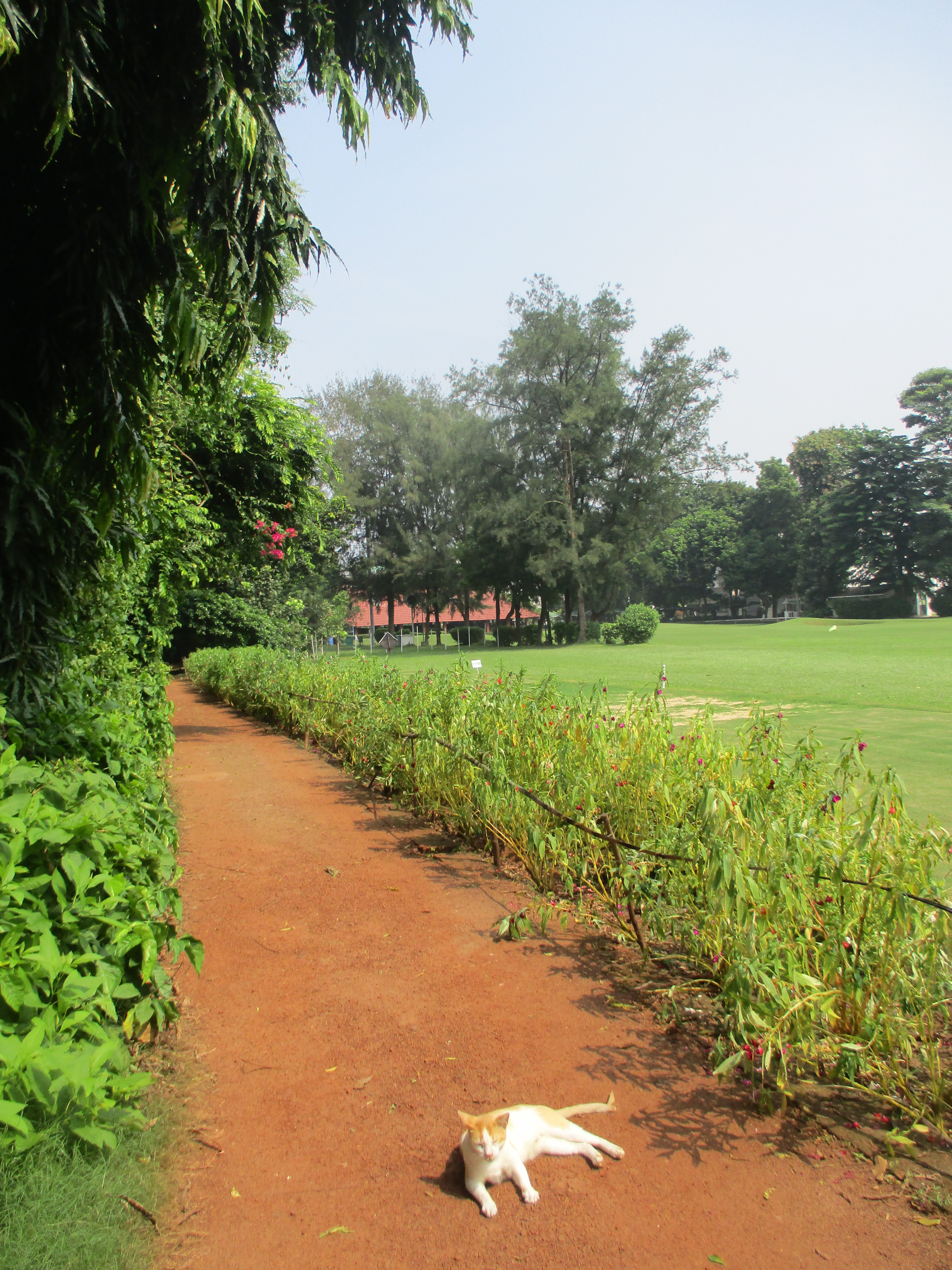 Après une courte de nuit dans une chambre qui ne nous a pas franchement convaincu au niveau de la propreté (mais nous avons réalisé un miracle de la science sur nos quatre jours de présence ici : en effet, quand on ouvre les fenêtres en mettant le ventilateur en marche, l’humidité s’efface et les moisissures actives avec elle ! (être archiviste apporte parfois quelques compétences pratiques). Nous découvrons ensuite le complexe… qui s’avère être franchement beau. Un immense jardin entoure la partie hôtelière, de nombreux bâtiments accueillent différents espaces bar, restaurant, piscine couverte, il y a un golf, des chemins de promenade, des oiseaux, des chats… un vrai poumon vert où il est extrêmement plaisant de déambuler. Ce sera le grand point fort de ce lieu pour nous (et il y a des chats, alors forcément on adore) !