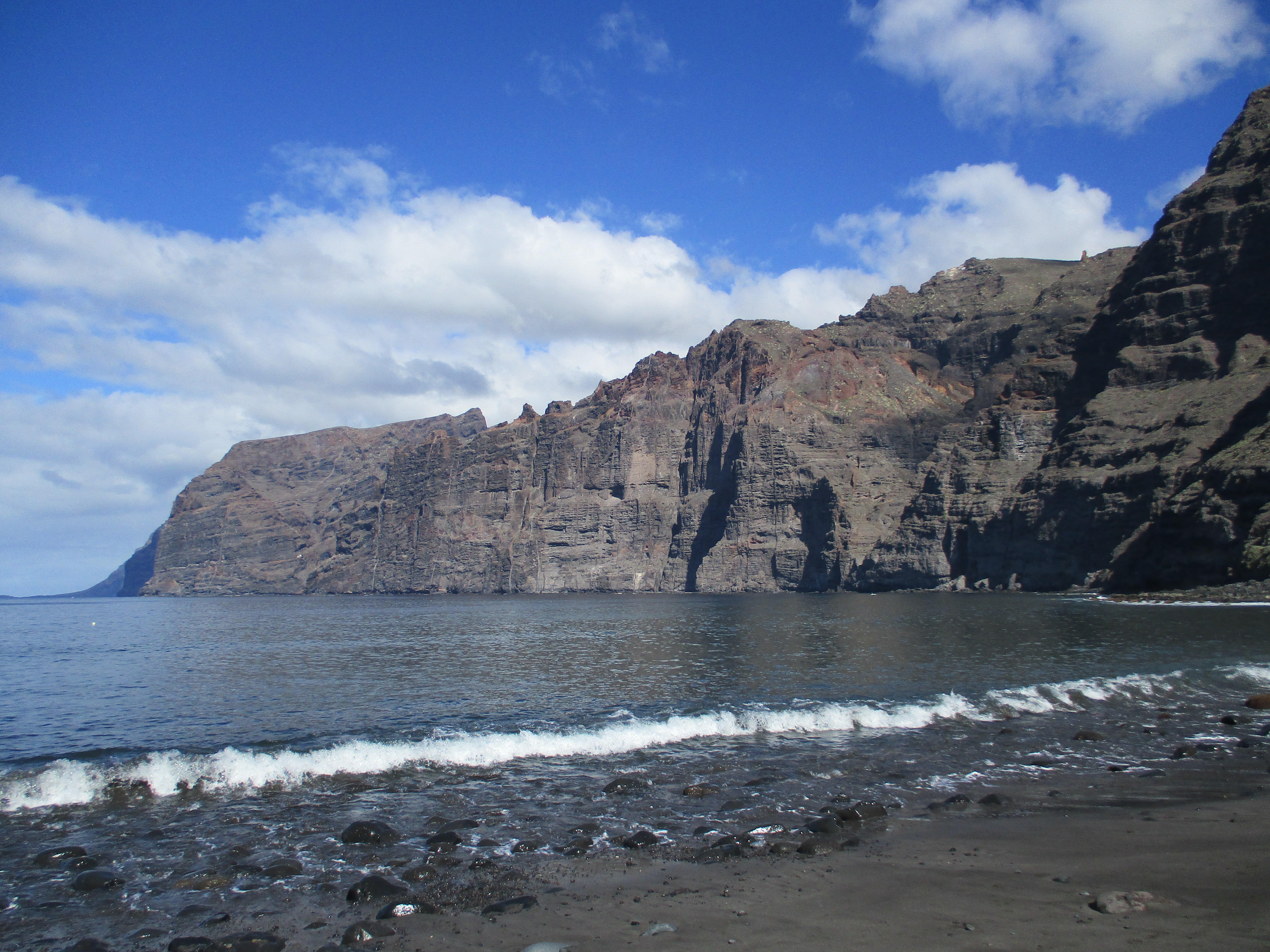 Notre nouvelle journée débute par une excursion à Los Gigantes, au sud ouest de l’île. Notre but ? Aller admirer les falaises noires se dressant face à l’océan et pouvant atteindre jusqu’à 600 mètres de haut. Pour cela, nous nous garons dans les hauteurs de la petite ville et descendons tranquillement à pied le long des immeubles résidentiels. Car nous sommes d’ailleurs un peu surpris de l’architecture, très typique des stations balnéaires, avec balcons orientés vers le soleil et supérettes au rez-de-chaussée ! Il y a beaucoup de touristes, principalement anglais, et les plages sont peuplées de personnes qui se baignent (pour ordre d’idée, nous nous promenions en veste).