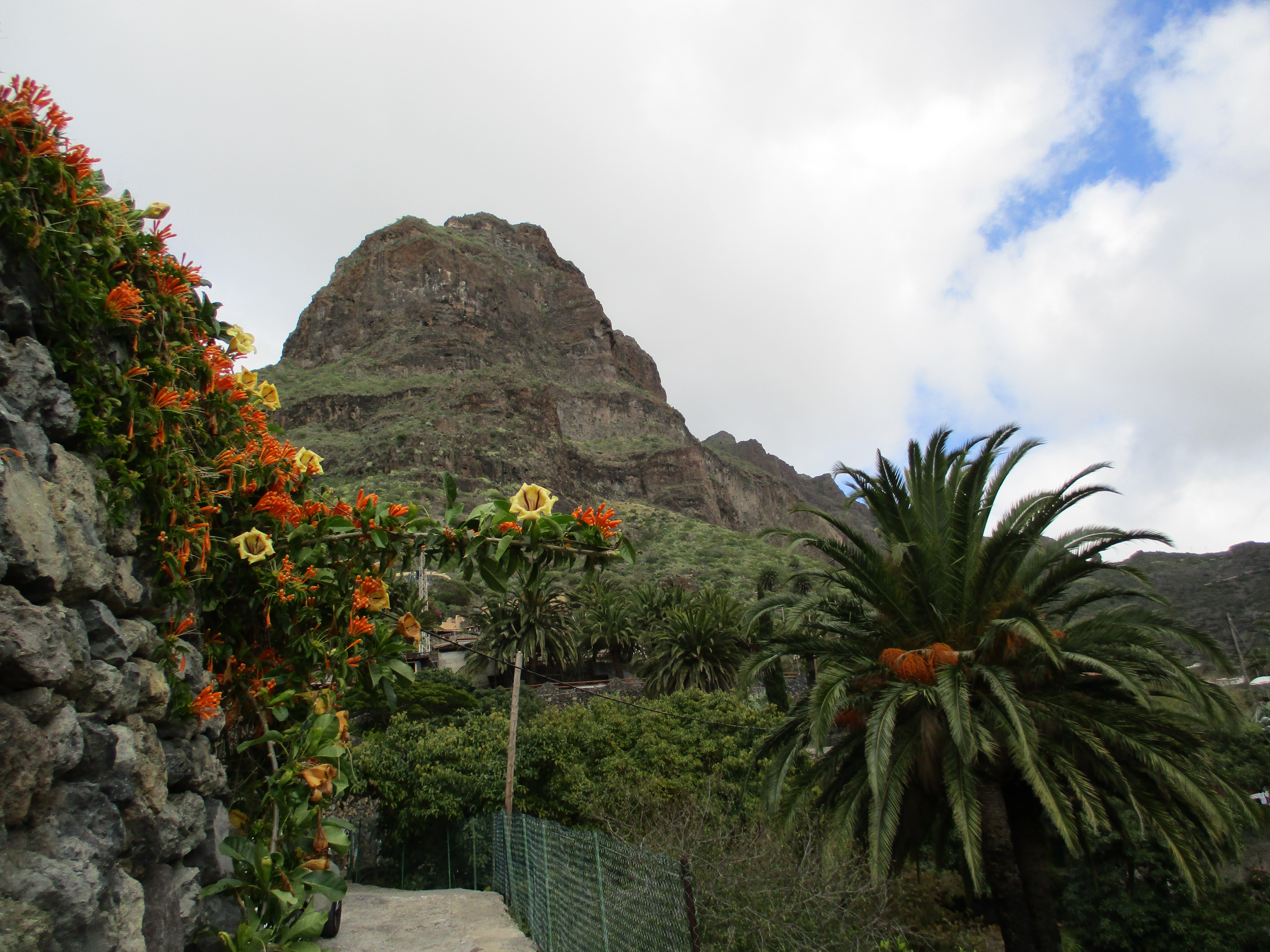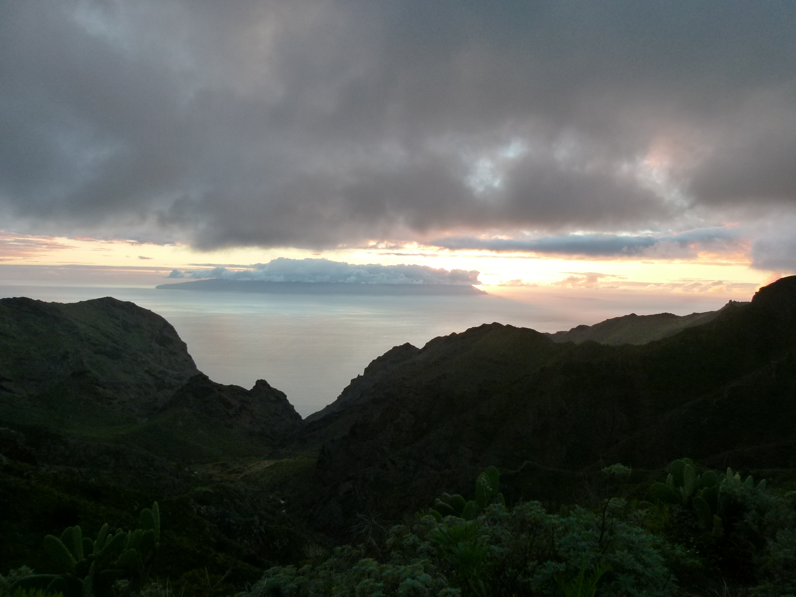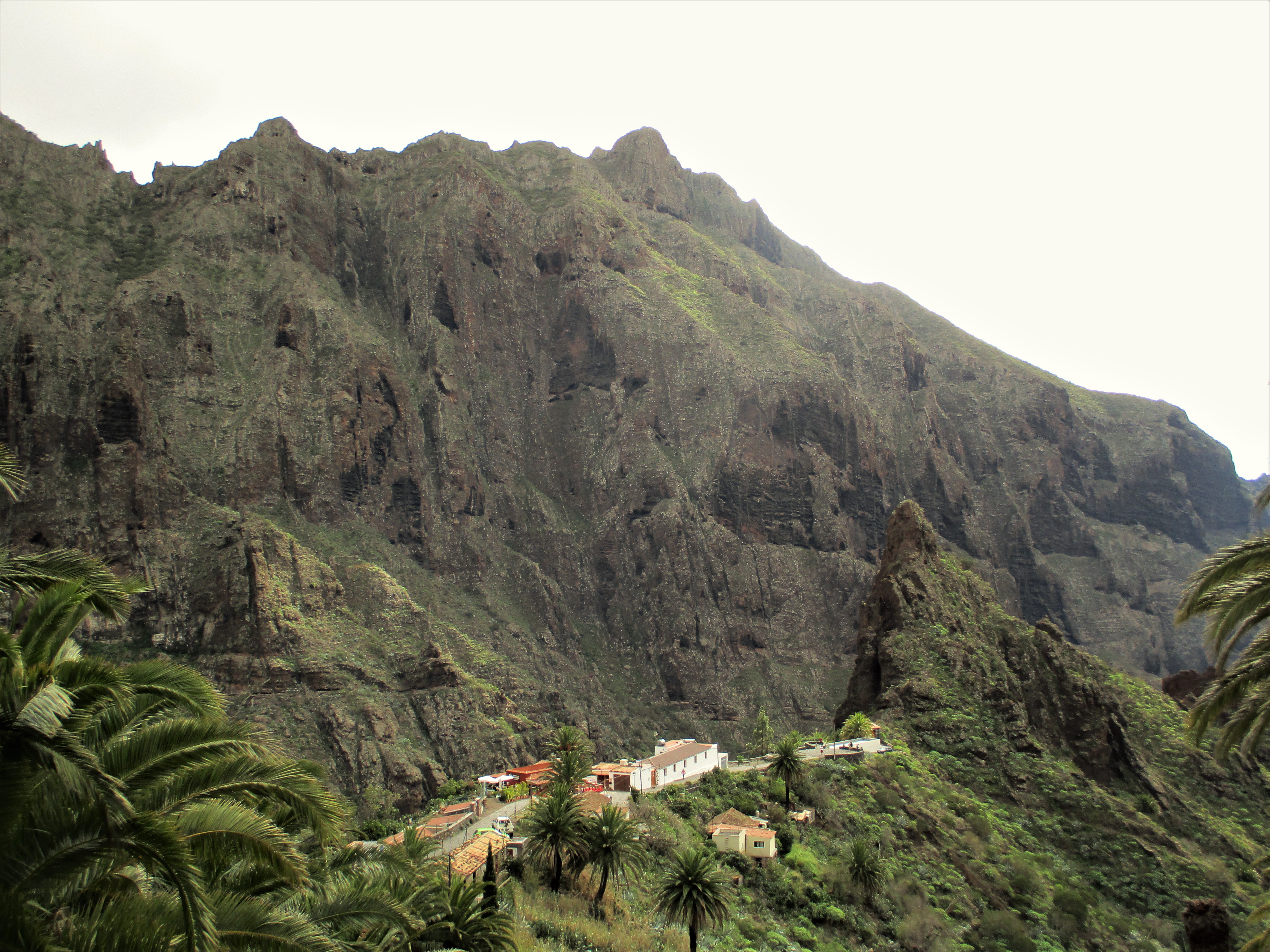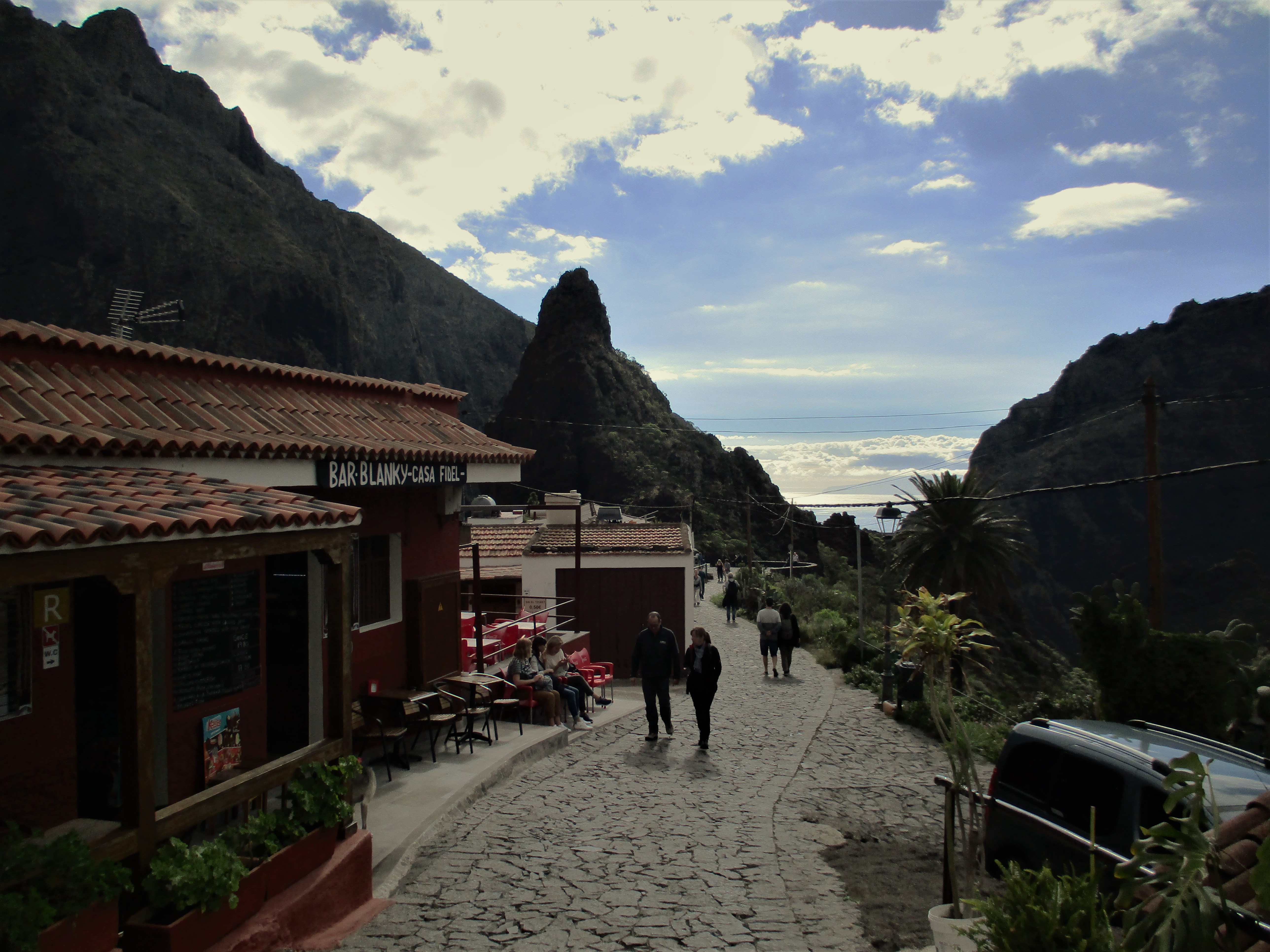 Le site de Masca est surtout connu pour être un point de départ pour des randonnées apparemment magnifiques : de notre côté, nous ne sommes pas vraiment attirés par cette facette-là du tourisme, préférant marcher dans les villages et admirer les paysages. Et ici, nous sommes à nouveau servis : entre la vue sublime sur les flancs des montagnes et l’océan au loin, nous sommes littéralement transportés dans un autre monde. Nous apercevons même l’île de la Gomera apparaitre dans la brume au soleil couchant, le signe qu’il est pour nous temps de rentrer avant la nuit noire… et d’aller déguster une paella, pourquoi pas au « Deep Blue » de Playa de las Americas ?