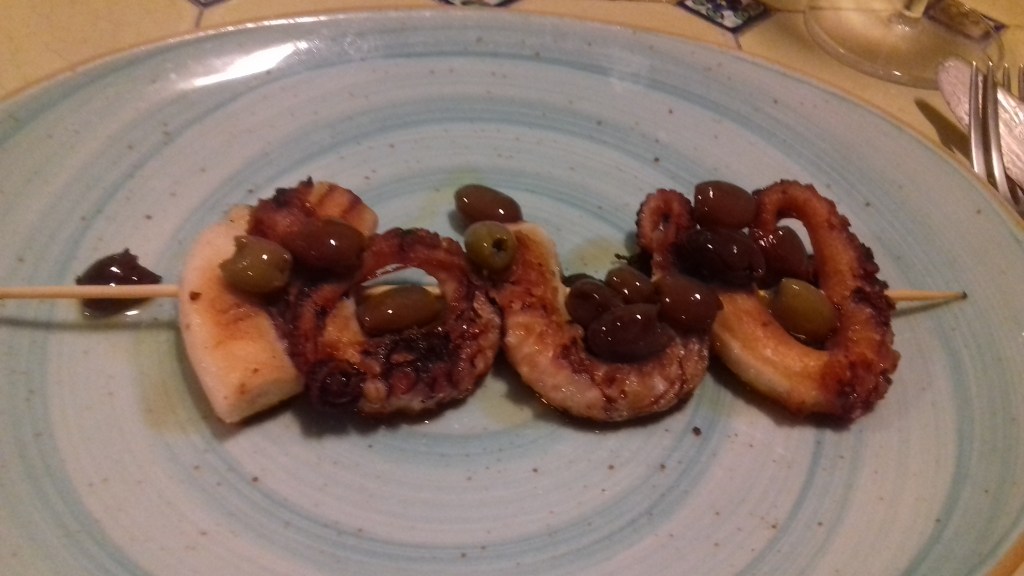Nous retournons ensuite à La Spezia afin, 1 : de profiter également de cette jolie ville, 2 : de conjurer le sort de la veille en allant manger dans un très bon restaurant repéré depuis la maison sur Tripadvisor, et dans lequel nous avons réservé notre place la veille au soir sur le chemin de retour à l’hôtel. Et là, nous ne sommes absolument pas déçus, bien au contraire, nous nous sommes régalés ! L’Osteria da Bartali est alors classée n°1 des restaurants de la ville (et n’a pas volé son titre), et, après un mix de fruits de mer en guise d’entrée, nous y dégustons, monsieur un pavé de thon, et moi une brochette de poulpe. Le tout dans une ambiance « salon » avec papier peint coloré et tables dressées comme à la maison. Et quelle gentillesse ! Un plaisir d’avoir découvert ce lieu (et de constater que, parfois, Tripadvisor donne tout de même de bons avis !)