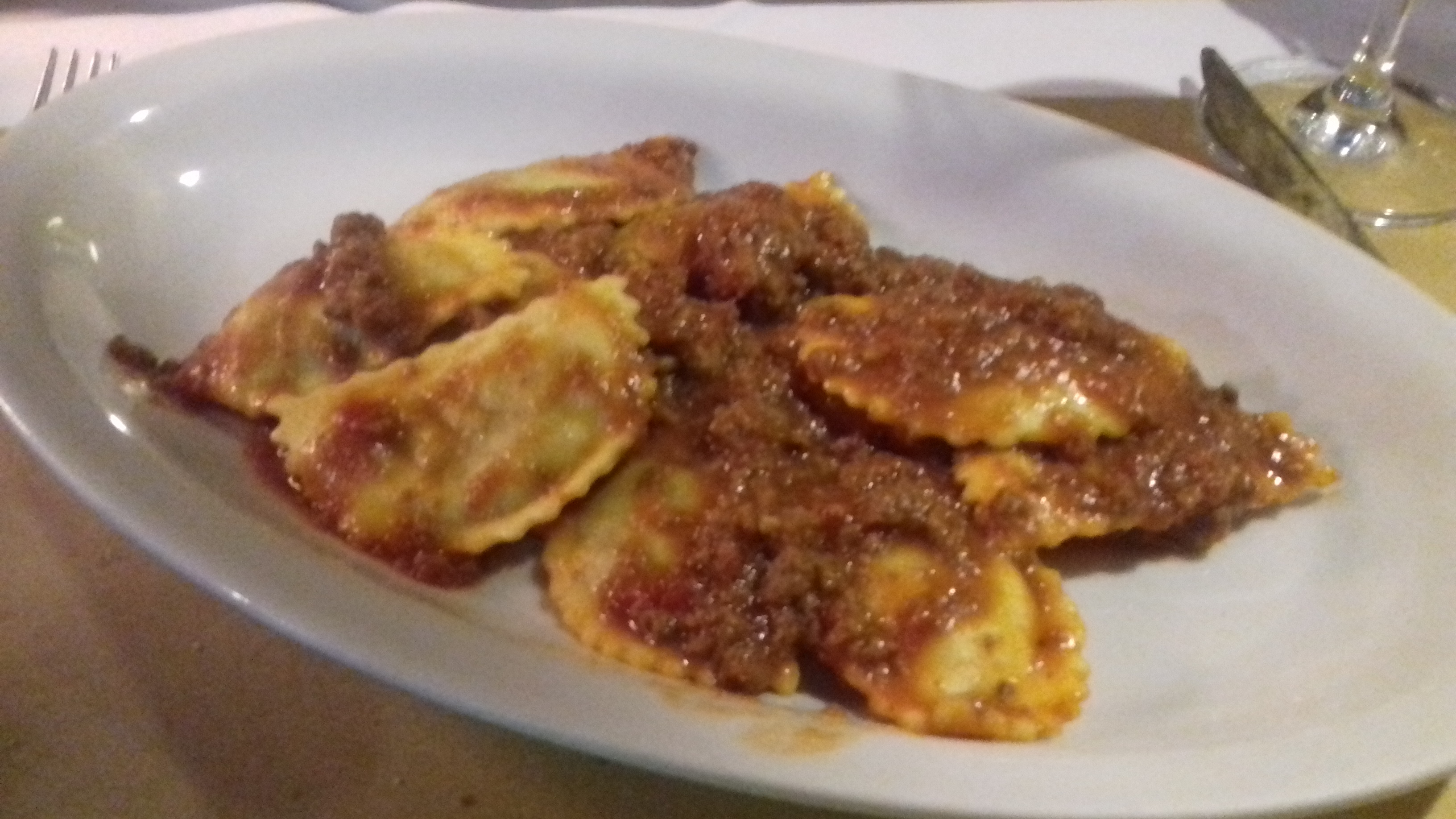 Et là, nous avons une chance inouïe. A deux minutes à pied de notre hébergement, dans la rue Santa Maria permettant de rejoindre la Piazza del Duomo, des tables sont en train d’être dressées devant la trattoria Bar & food 62. Nous demandons s’il reste des places, la réponse est immédiatement positive, nous sommes installés en extérieur, immédiatement, un 31 décembre, à deux pas d’un des plus beaux monuments du pays ! Et la cuisine, n’en parlons même pas : nous nous attendions à un « truc à touriste » au regard de la géographie du lieu et de l’empressement du service, et bien pas du tout. Une cuisine confectionnée au jour le jour, par la maman du serveur, avec des produits locaux : on se laisse tenter par un plateau de fromages suivi d’un gratin de tripes pour monsieur et de ravioles pour moi, et c’était un régal. Le tout agrémenté d’une bouteille de vin rouge italien, le moment était parfait, et nous a permis de bien profiter de notre soirée avant de rejoindre un pont sur l’Arno pour assister au feu d’artifice de la nouvelle année.