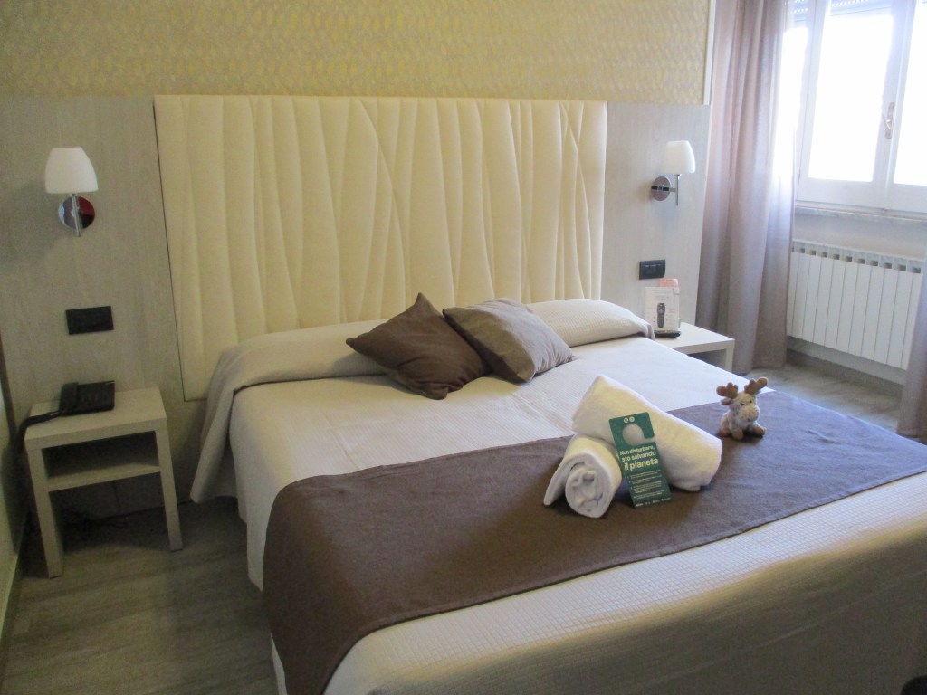 Nous nous installons immédiatement à l’hôtel Stella del Mare : situé le long d’un grand axe, il permet de rejoindre le bord de mer en moins de 5 minutes à pied. La chambre est très confortable, avec un agencement assez intrigant puisque la salle de bain est glissée à l’arrière de la tête de lit (ce qui nous vaut une petite minute d’interrogation en ne la trouvant pas spontanément !). Nous garons toutefois la voiture dans la rue, l’hôtel ne disposant pas de parking souterrain (mais nous apprendrons plus tard que le risque de submersion marine est très fort en ce lieu, et que c’est peut-être une bonne chose pour notre Titine).