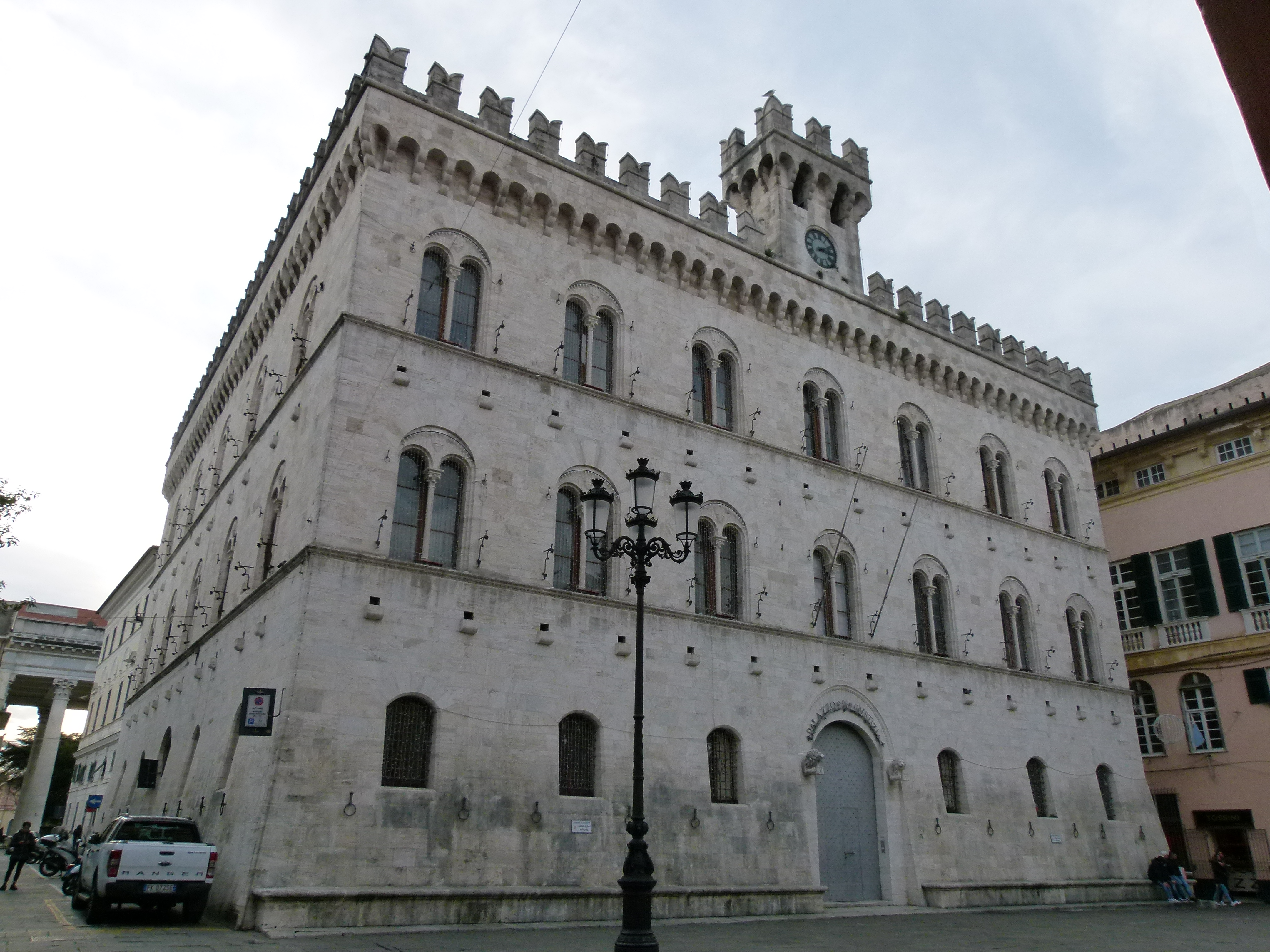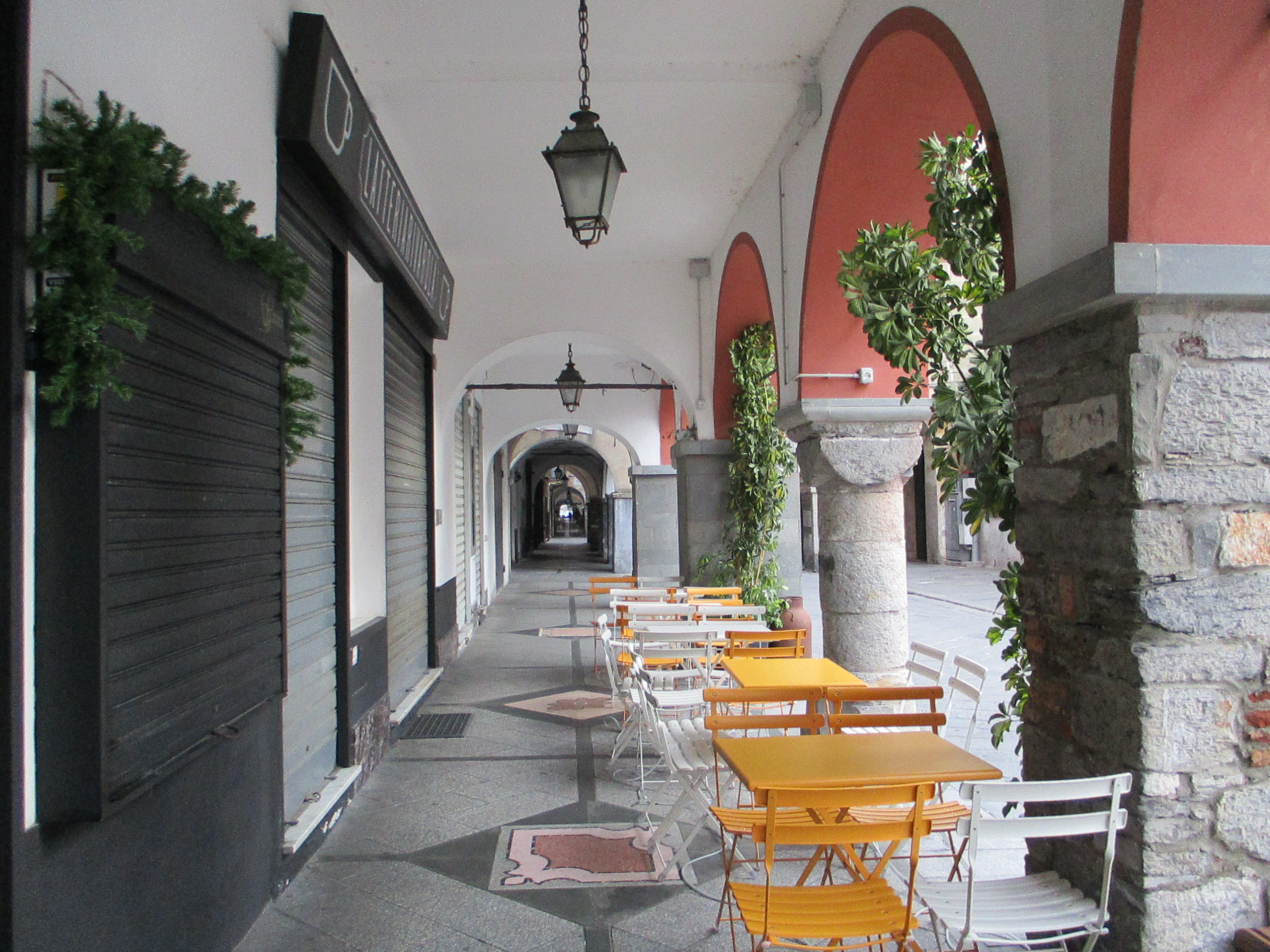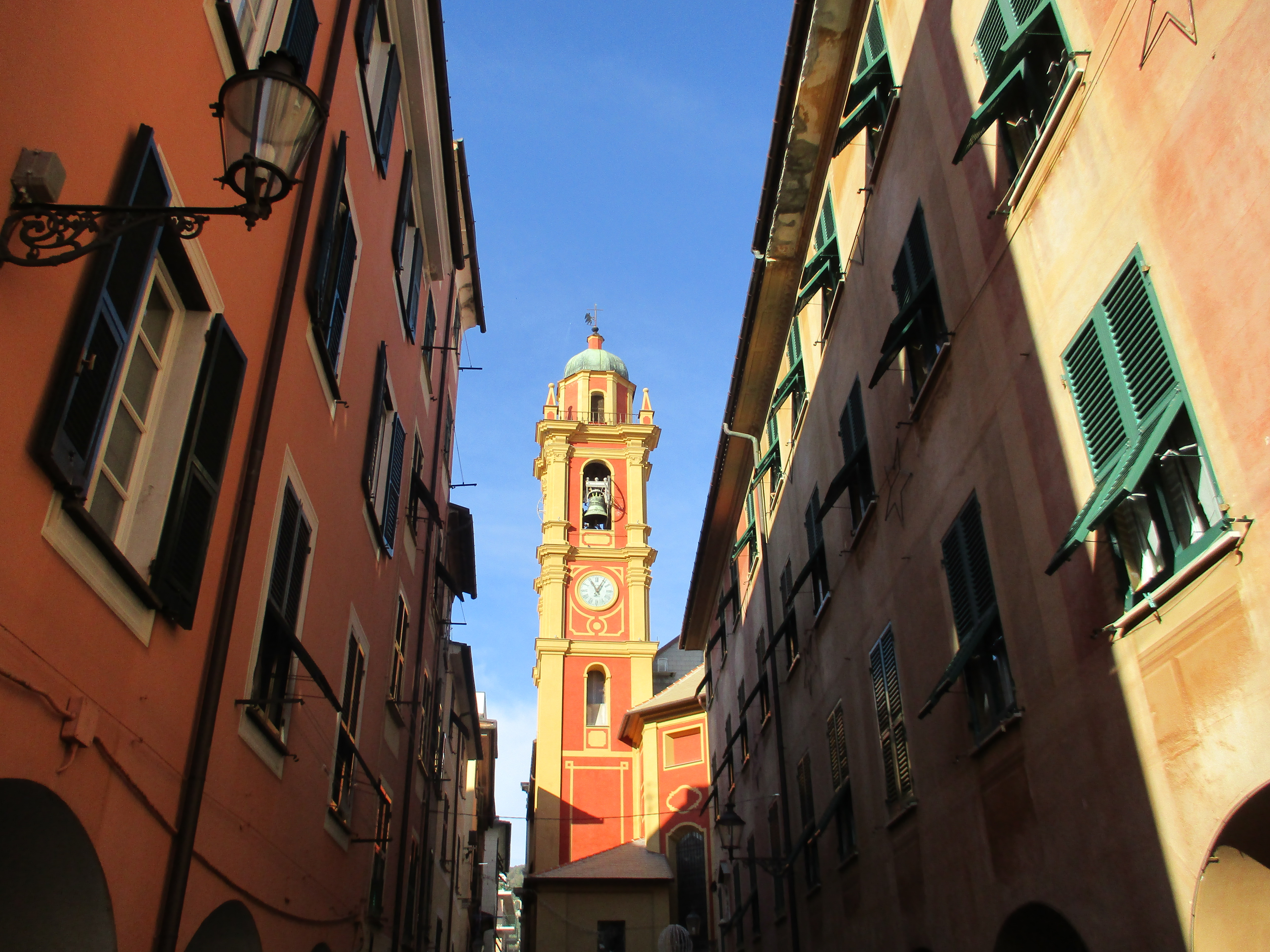 Après cette installation donc, nous faisons nos premiers pas dans la ville en arpentant littéralement de long en large son Borgolungo, son centre historique : en prenant la rue à droite juste derrière l’hôtel, nous arrivons sur la statue de Victor Emmanuel et la cathédrale de Chiavari (fermée… ça commence !), rejoignons le palais de justice, puis les rues du centre-ville dont les commerces se cachent sous des arcades (il doit faire bien chaud en été). Les façades des maisons sont colorées, des vestiges de muraille affleurent ici et là, et le jardin botanique (en travaux) nous permet de prendre un peu de hauteur pour admirer la ville d’en haut.