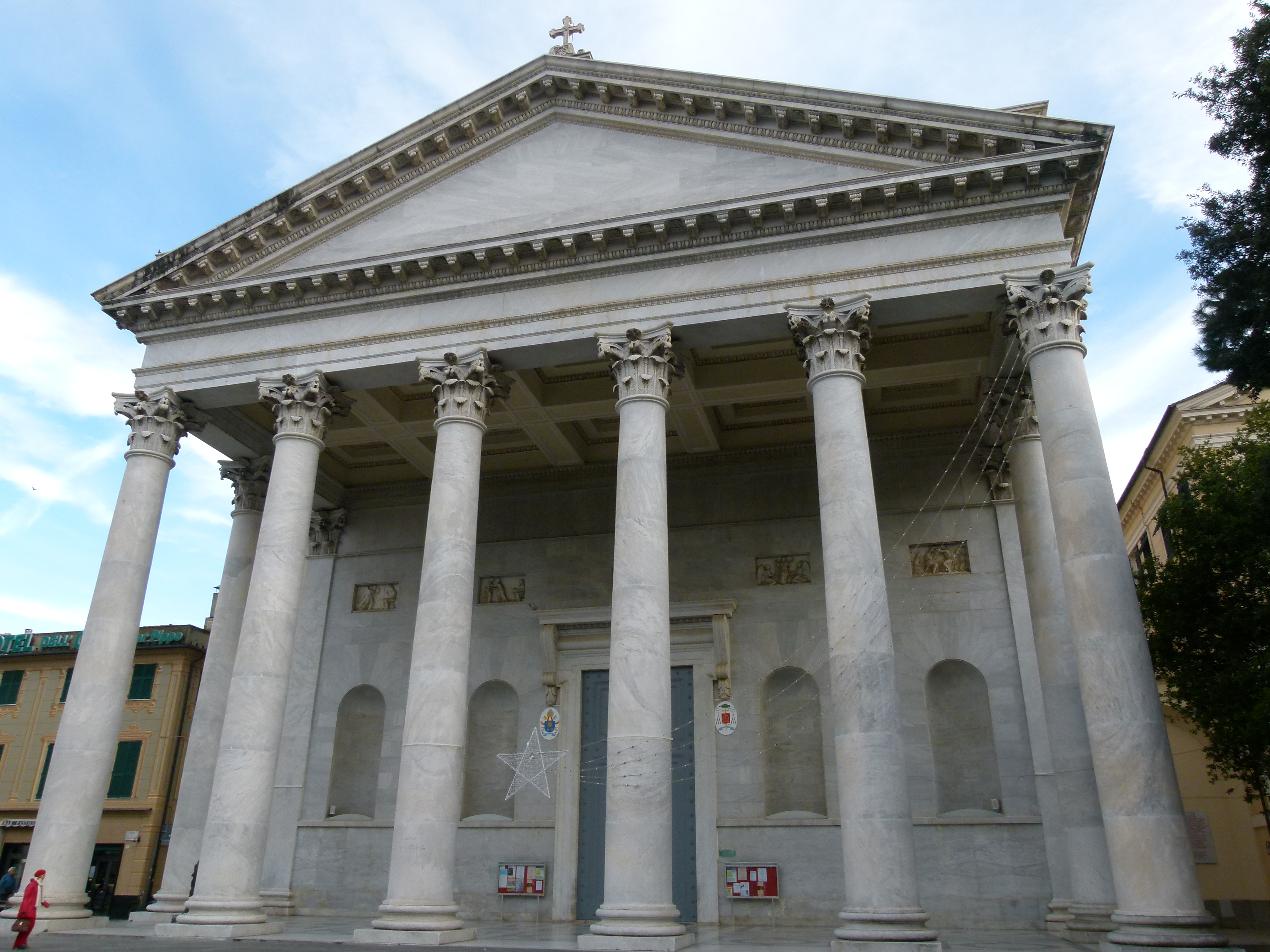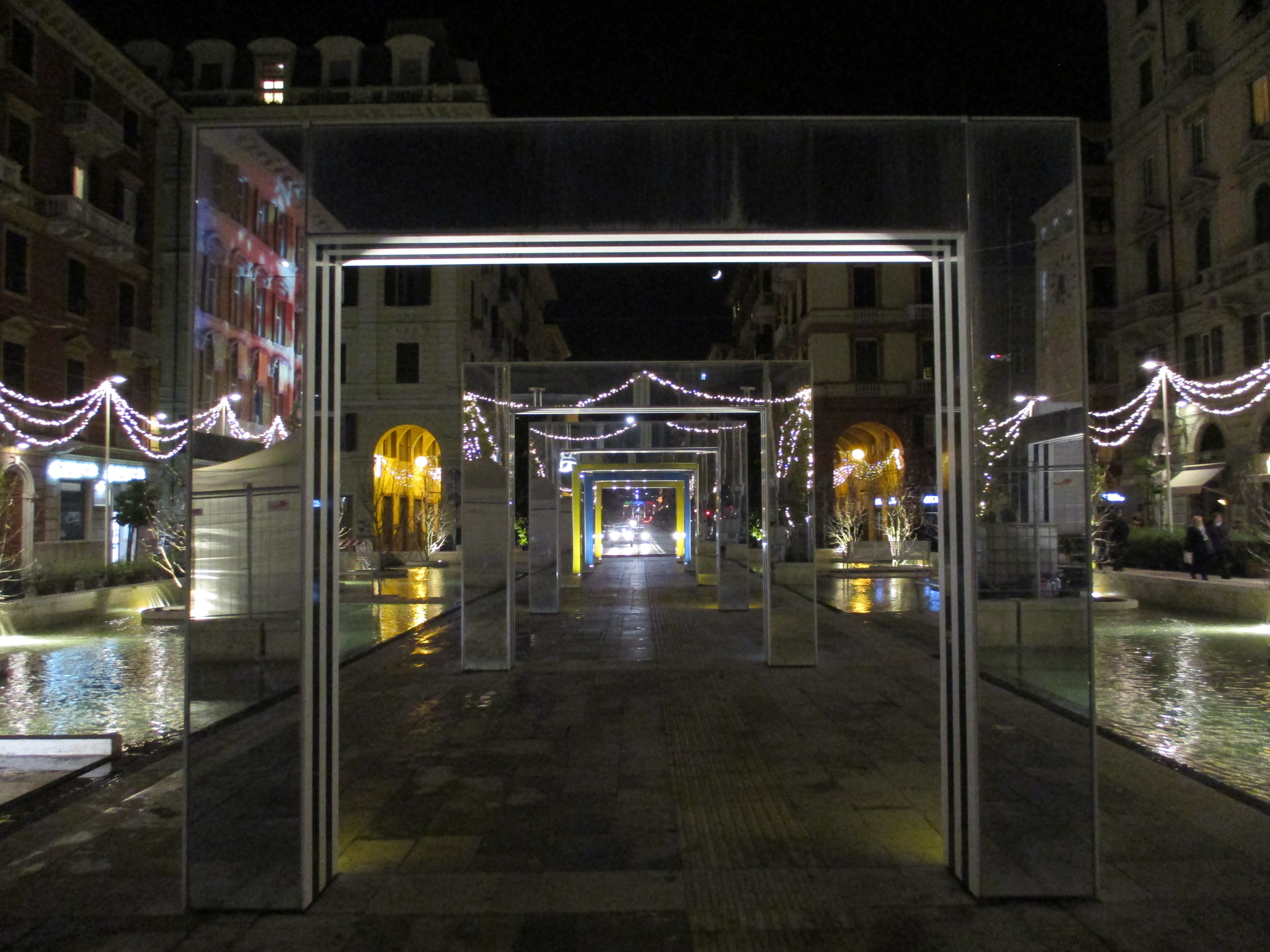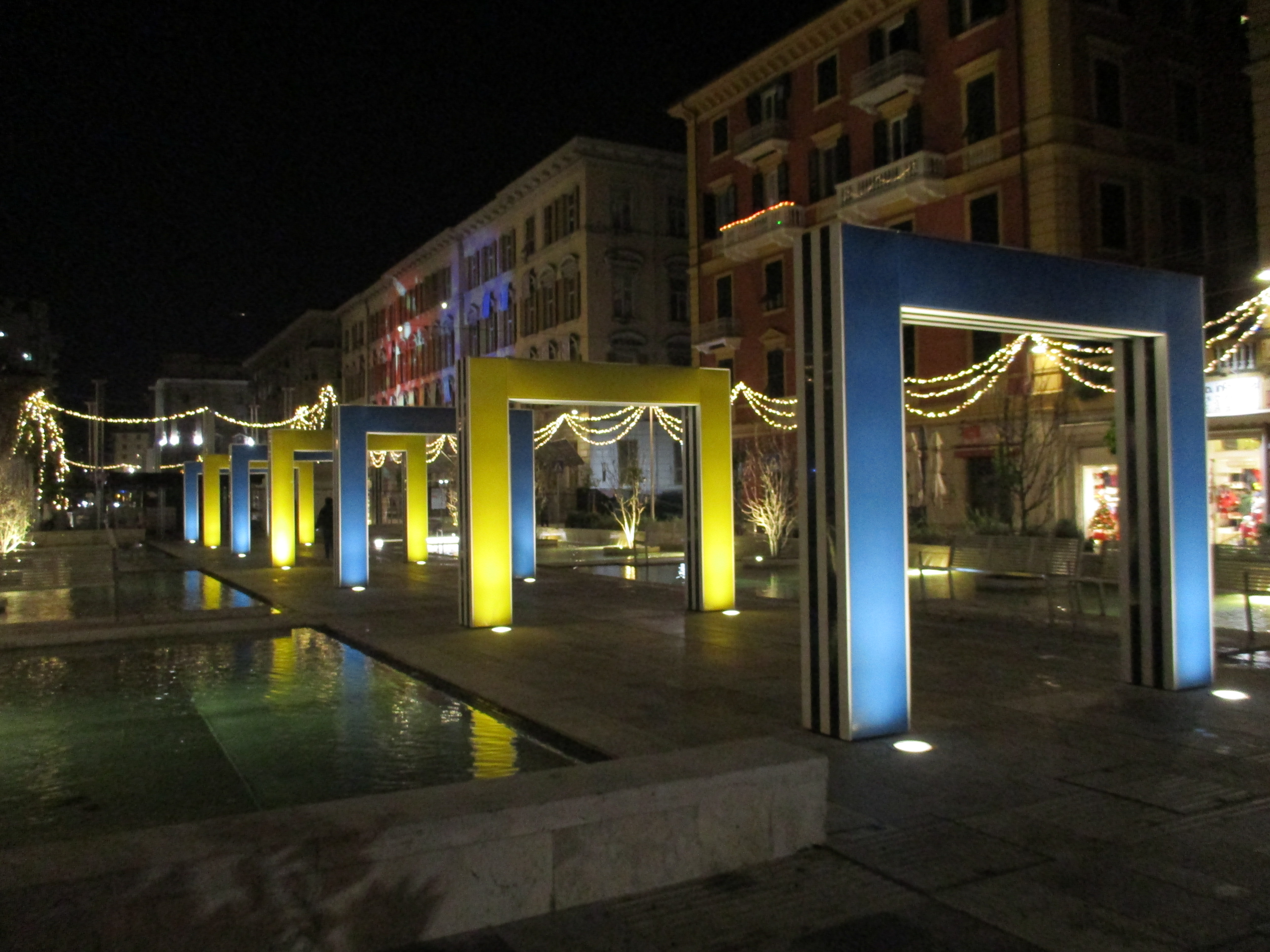 Après cette installation donc, nous faisons nos premiers pas dans la ville en arpentant littéralement de long en large son Borgolungo, son centre historique : en prenant la rue à droite juste derrière l’hôtel, nous arrivons sur la statue de Victor Emmanuel et la cathédrale de Chiavari (fermée… ça commence !), rejoignons le palais de justice, puis les rues du centre-ville dont les commerces se cachent sous des arcades (il doit faire bien chaud en été). Les façades des maisons sont colorées, des vestiges de muraille affleurent ici et là, et le jardin botanique (en travaux) nous permet de prendre un peu de hauteur pour admirer la ville d’en haut.
