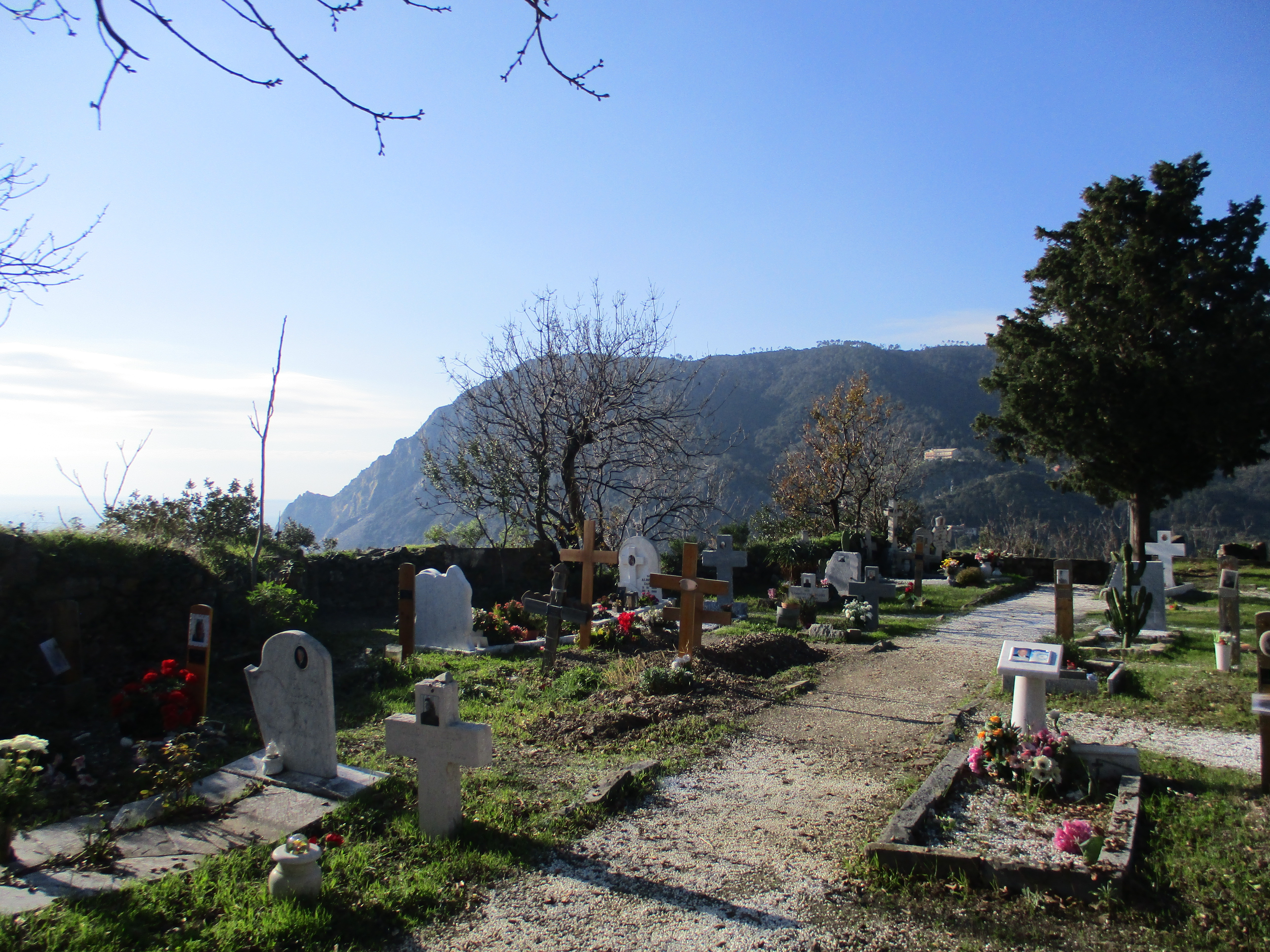 La promenade du bord de mer est aménagée, nous pouvons ainsi déambuler paisiblement avec vue sur la mer Méditerranée. Nous imaginons bien les rangées de parasols qui doivent colorer la plage à la saison estivale, même si nous trouvons que le sol doit être quelque peu dur à supporter toute une journée : point de sable, mais des petits cailloux ! Nous rejoignons par là un bunker tourné vers la mer (sur lequel monsieur ne peut s’empêcher de grimper, d’ailleurs), puis gravissons le chemin de plus en plus raide afin de rejoindre le couvent des Capucins et son église Saint François (dans laquelle se trouve tout de même une Crucifixion de Antoon van Dyck !), puis le cimetière fortifié avec vue imprenable sur l’immensité (à avoir des envies de louer une concession).