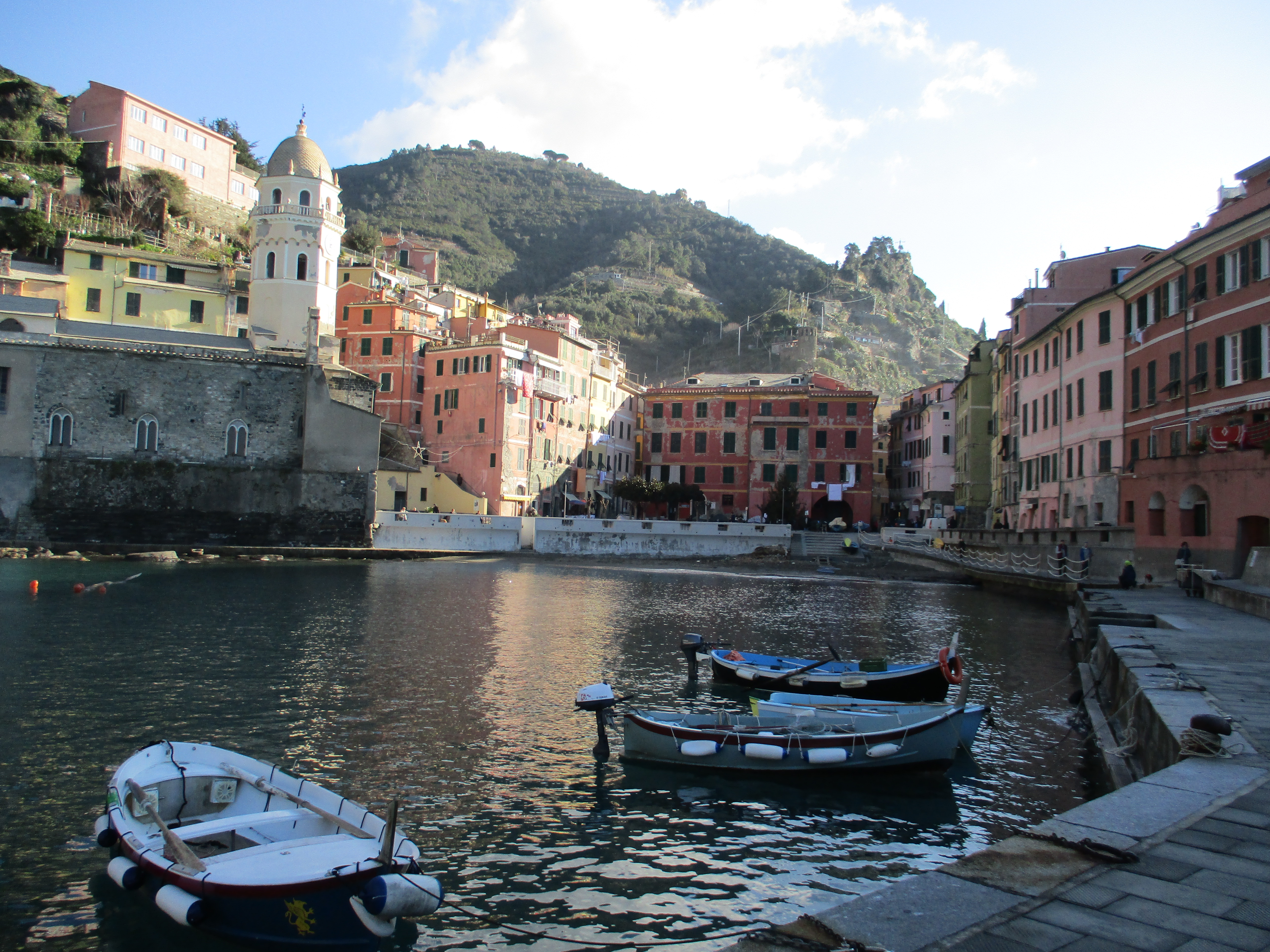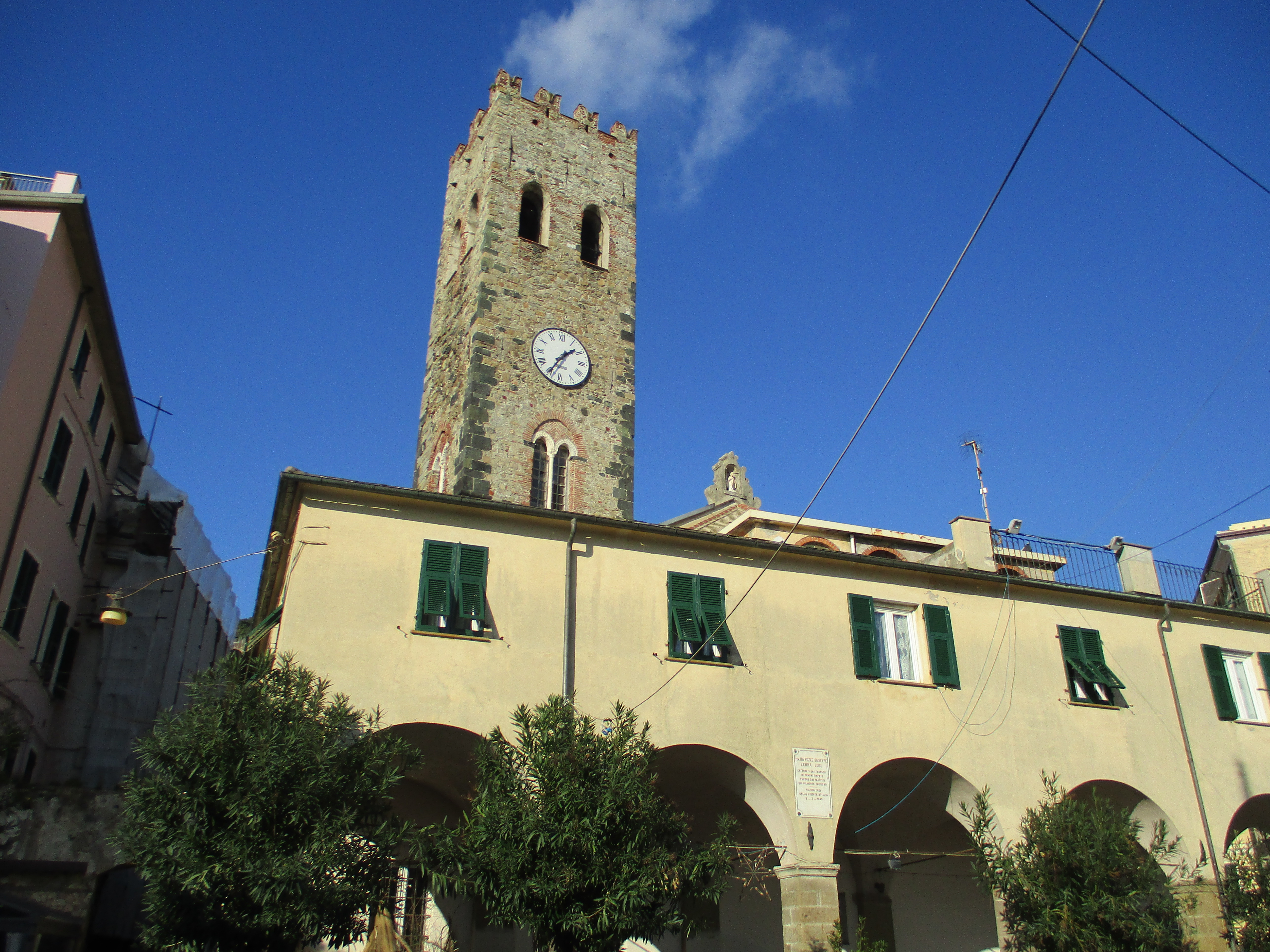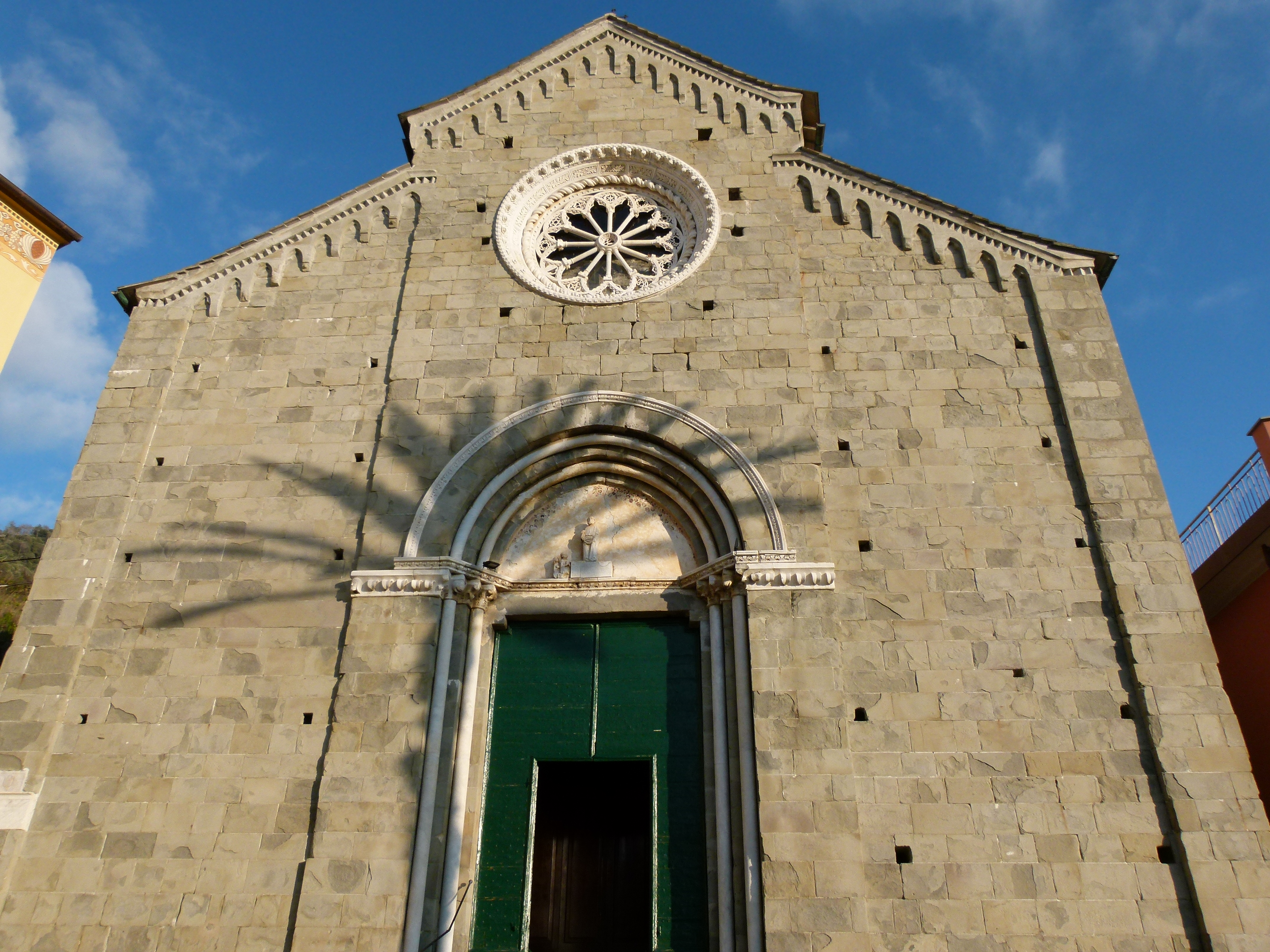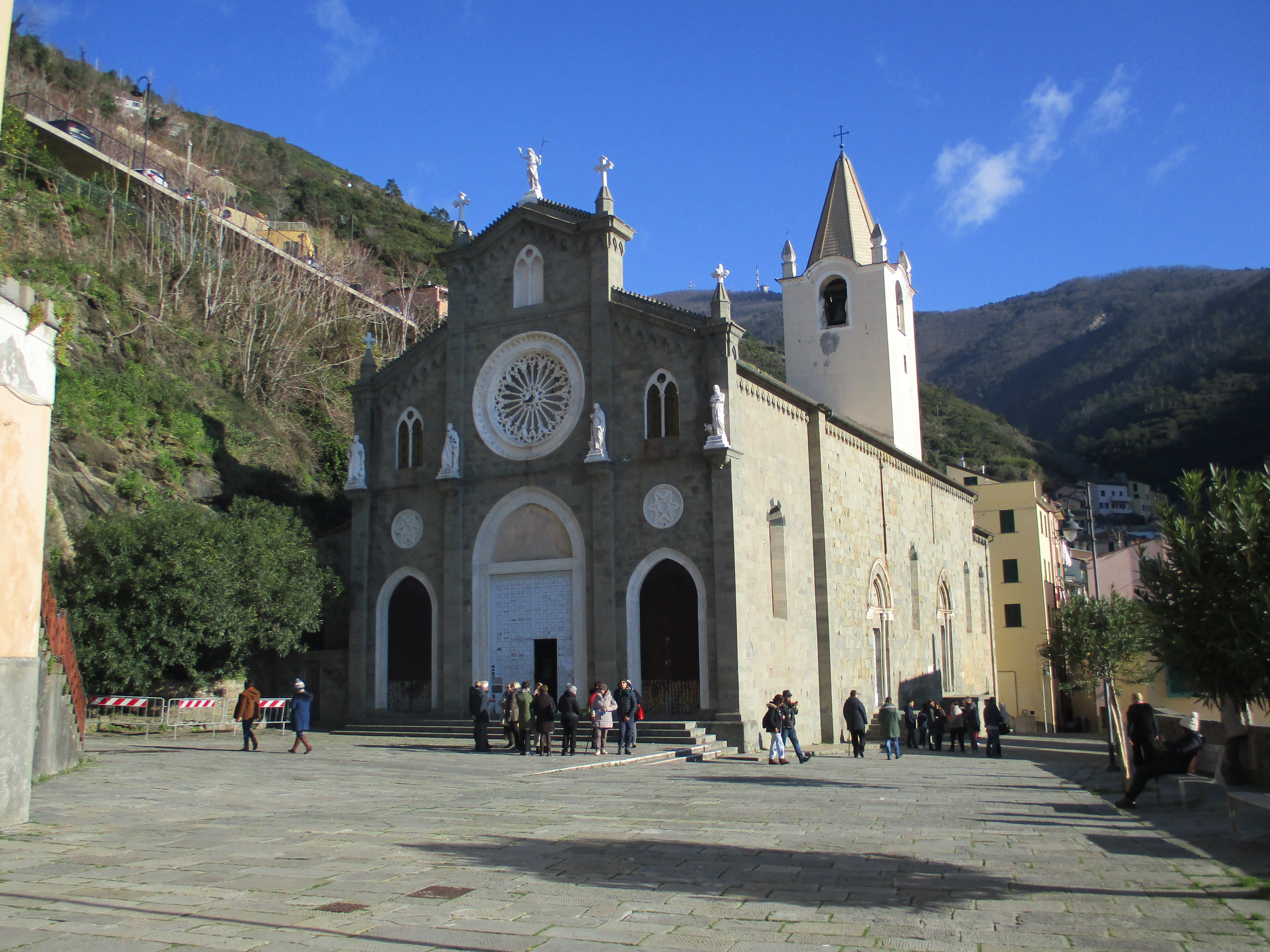 Dernière journée aux Cinque Terre, il s’agit d’en profiter ! Nous quittons cette fois définitivement notre hôtel pour prendre la direction Vernazza, dont le centre historique s’avère être magnifique, beaucoup plus « italien » comme on se l’imagine, avec des arcades, des palais, des portes ornementales… On descend doucement vers le port en admirant les bâtiments, avant de tomber nez-à-nez avec une église directement érigée sur ce dernier ! Dédiée à Sainte Marguerite d’Antioche, elle date du XIVe siècle tout de même, et son clocher s’élève à 40 mètres de hauteur ! Son intérieur est presque de style primitif, très sombre, avec des colonnes en pierres noires assemblées sans être taillées de manière homogène… une ambiance hors du temps comparée à celle que l’on retrouve sur le quai.