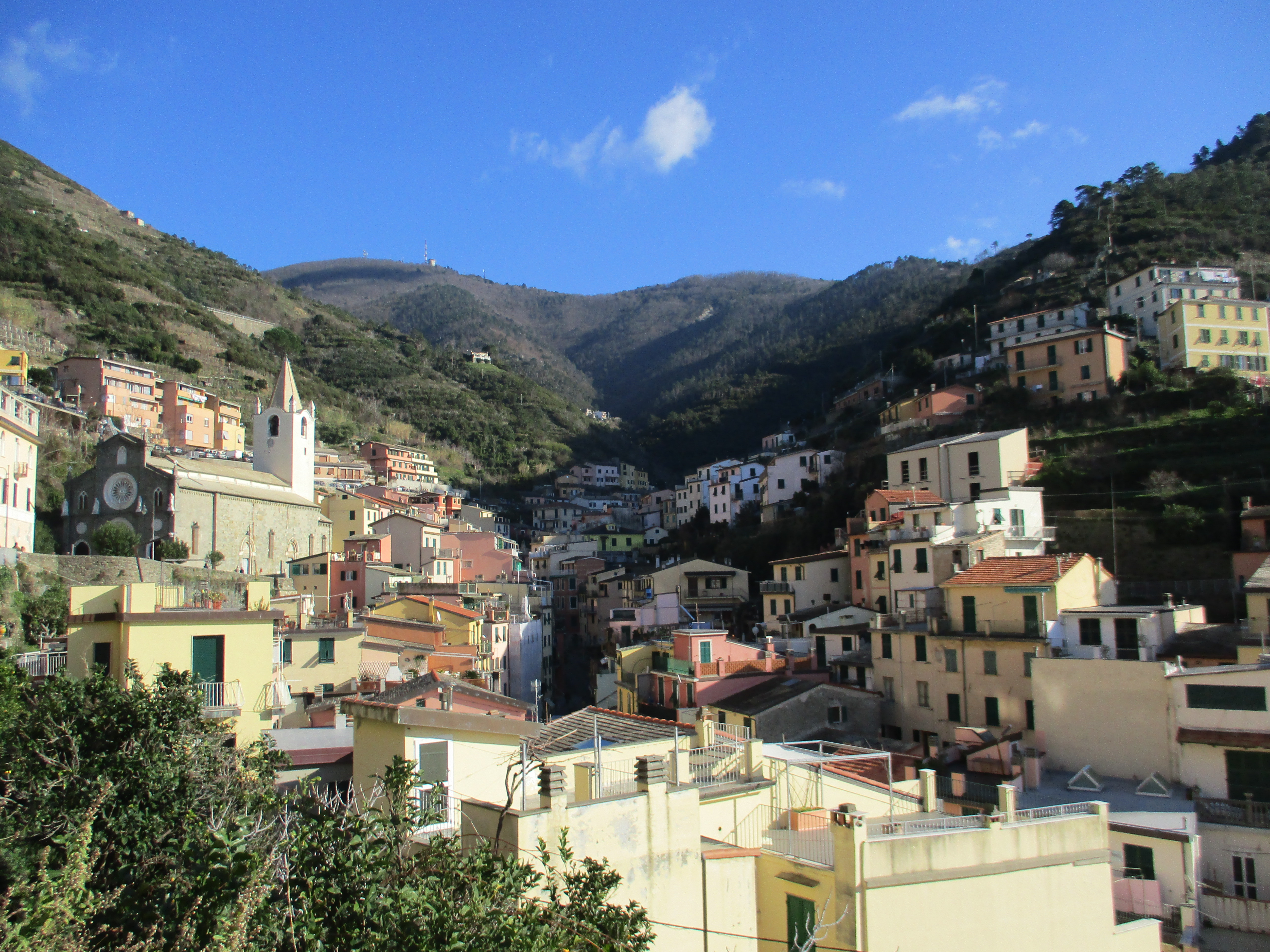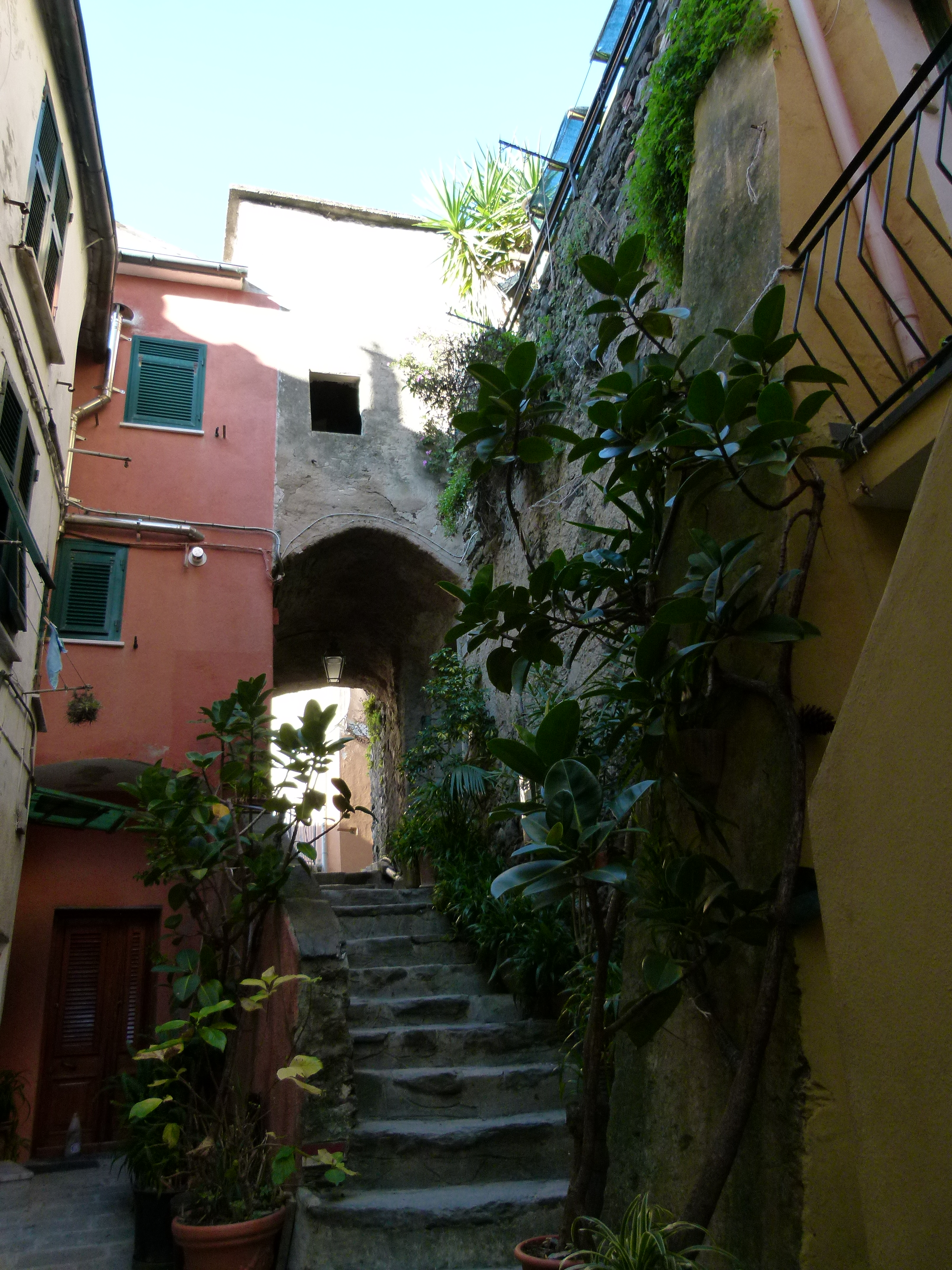 Nous rejoignons donc Riomaggiore et descendons la rue principale pour rejoindre la mer. La vue est très belle, les maisons également, mais nous prenons toujours plaisir à sortir des sentiers battus : une venelle nous tend les bras et nous découvrons un autre monde, beaucoup plus « résidentiel » composé d’entrelacs d’escaliers, de cours intérieures avec odeurs de linge en train de sécher au soleil, de maisons entassées les unes sur les autres… Un autre village, dans des rues que nous étions littéralement les seuls à fréquenter.