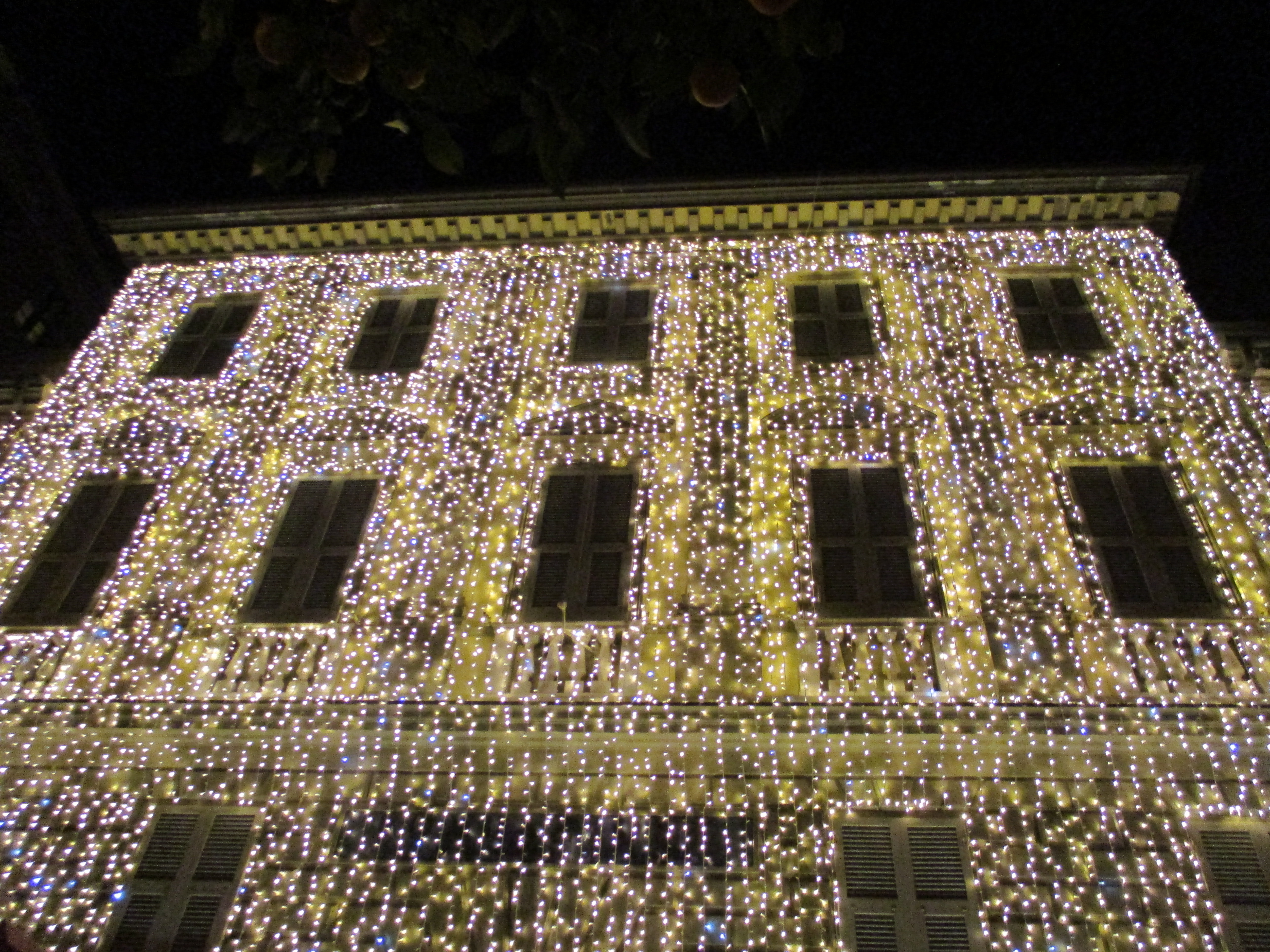 Et comme nous pouvons le voir sur la photo ci-contre, le soleil commence à décliner, et il nous faut rejoindre notre lieu d’hébergement situé non loin d’ici : La Spezia. Le temps de rejoindre la voiture et il fait quasiment nuit noire : cela nous permet toutefois d’aller admirer un phénomène se produisant annuellement, à savoir l’illumination d’une crèche géante sur les flancs de Manarola, visible uniquement d’en face. Nous nous garons d’un côté d’un court tunnel que nous franchissons à pied afin d’accéder au point de vue visible depuis le bord de la route. Un moment un peu magique (bien qu’un peu dangereux également au regard de la conduite de certains alors qu’une dizaine de piétons se tiennent sur le bas-côté !)