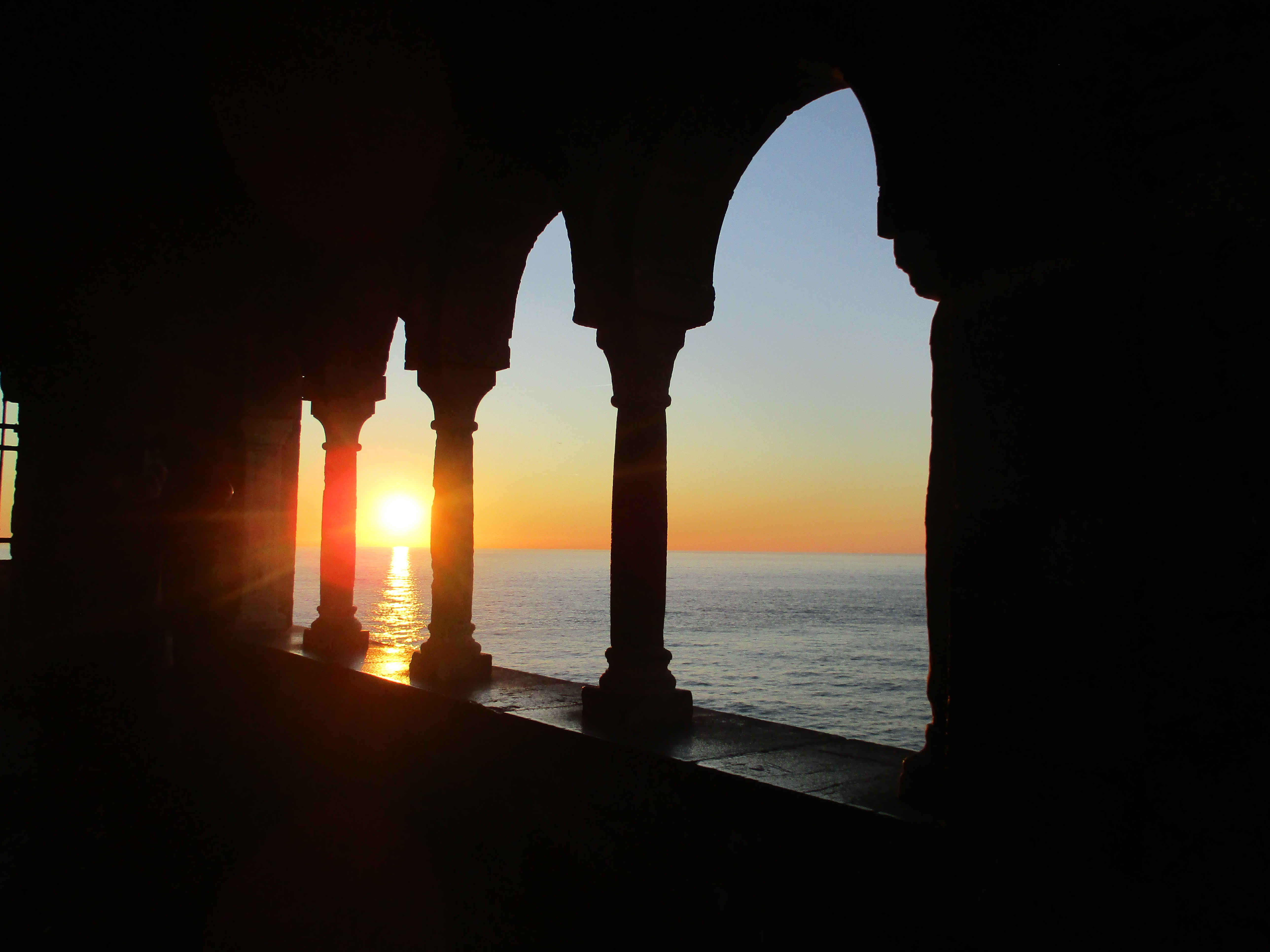Après une petite déambulation sur le port et dans les rues du village, nous rejoignons l’église Saint Pierre qui se tient à l’extrême bout du port, face à la mer, avec vue sur les falaises. Datant du XIIe siècle, elle est à rayures, comme la plupart des églises du secteur, et son intérieur est très sobre, avec de grands arcs boutant de pierre, la sensation est très paisible d’autant plus que l’on entend le ressac de la mer battant les rochers juste à l’extérieur. L’église se situe d’ailleurs quasiment sur ce qu’on nomme « la grotte de Byron », un lieu où le poète anglais aimait venir rêver à ses prochains écrits. Nous y admirons le paysage et le soleil qui se couche doucement sur la mer…