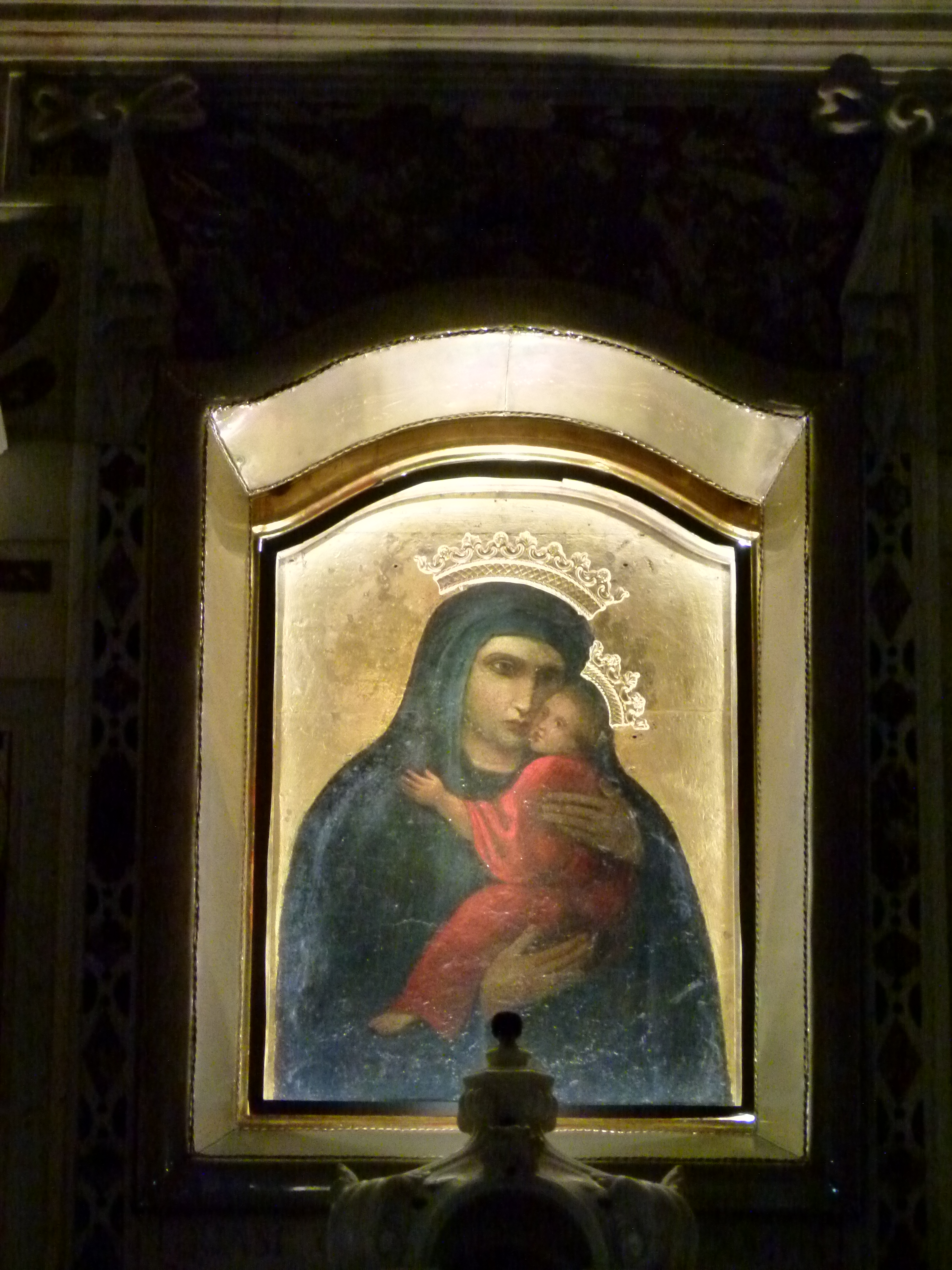 Et, afin de rester dans ce thème, nous prenons ensuite la voiture afin d’aller visiter le sanctuaire de Notre-Dame des Oliviers du XVIe siècle, situé en extérieur de la ville, sur une colline. Particularité : deux églises se superposent ici, la plus récente ayant été construite sur la première, datant du XIIe siècle. Une icône, qui serait miraculeusement apparue entre les branches d’un olivier en l’an 936, est visible dans la crypte.