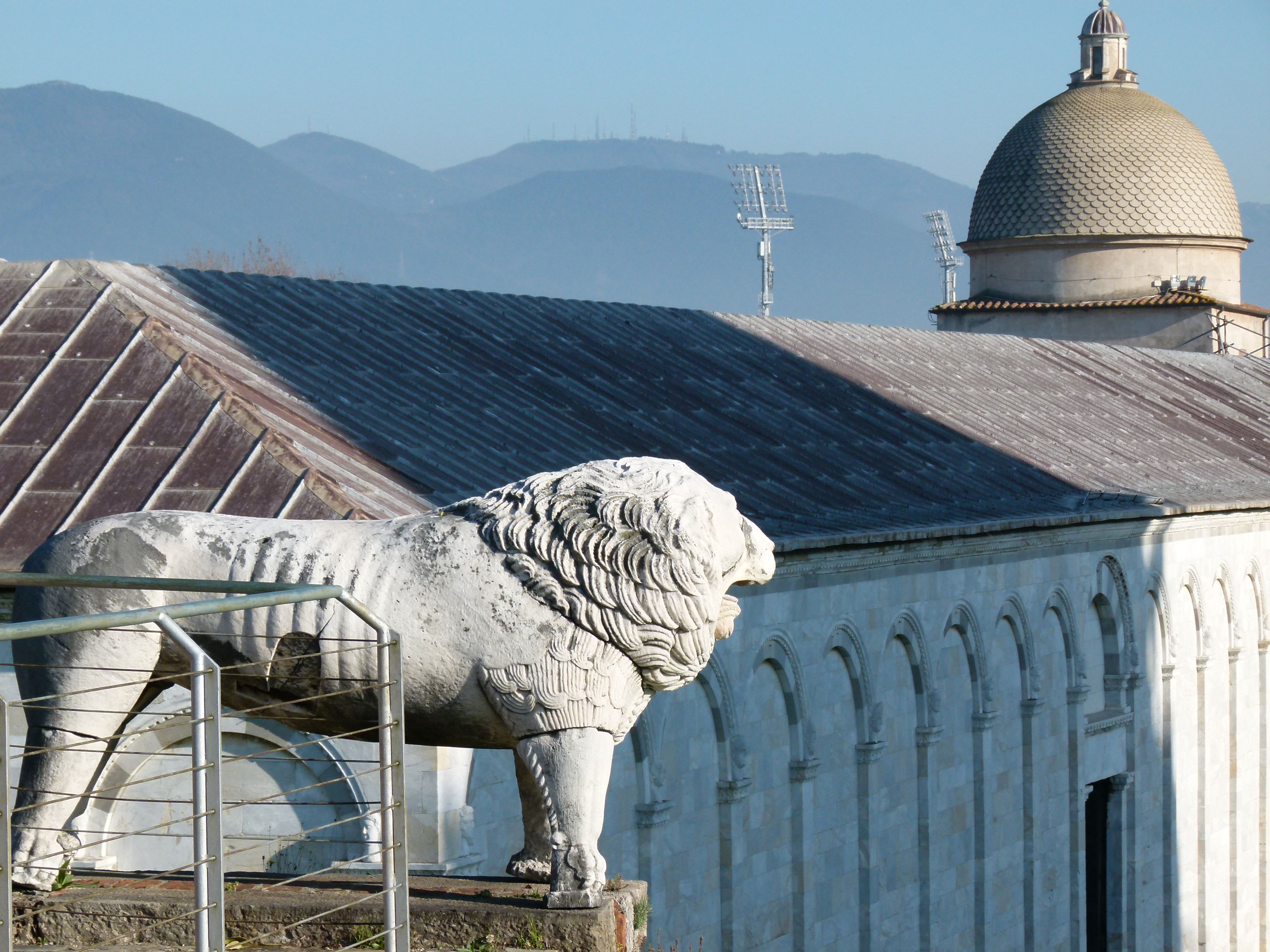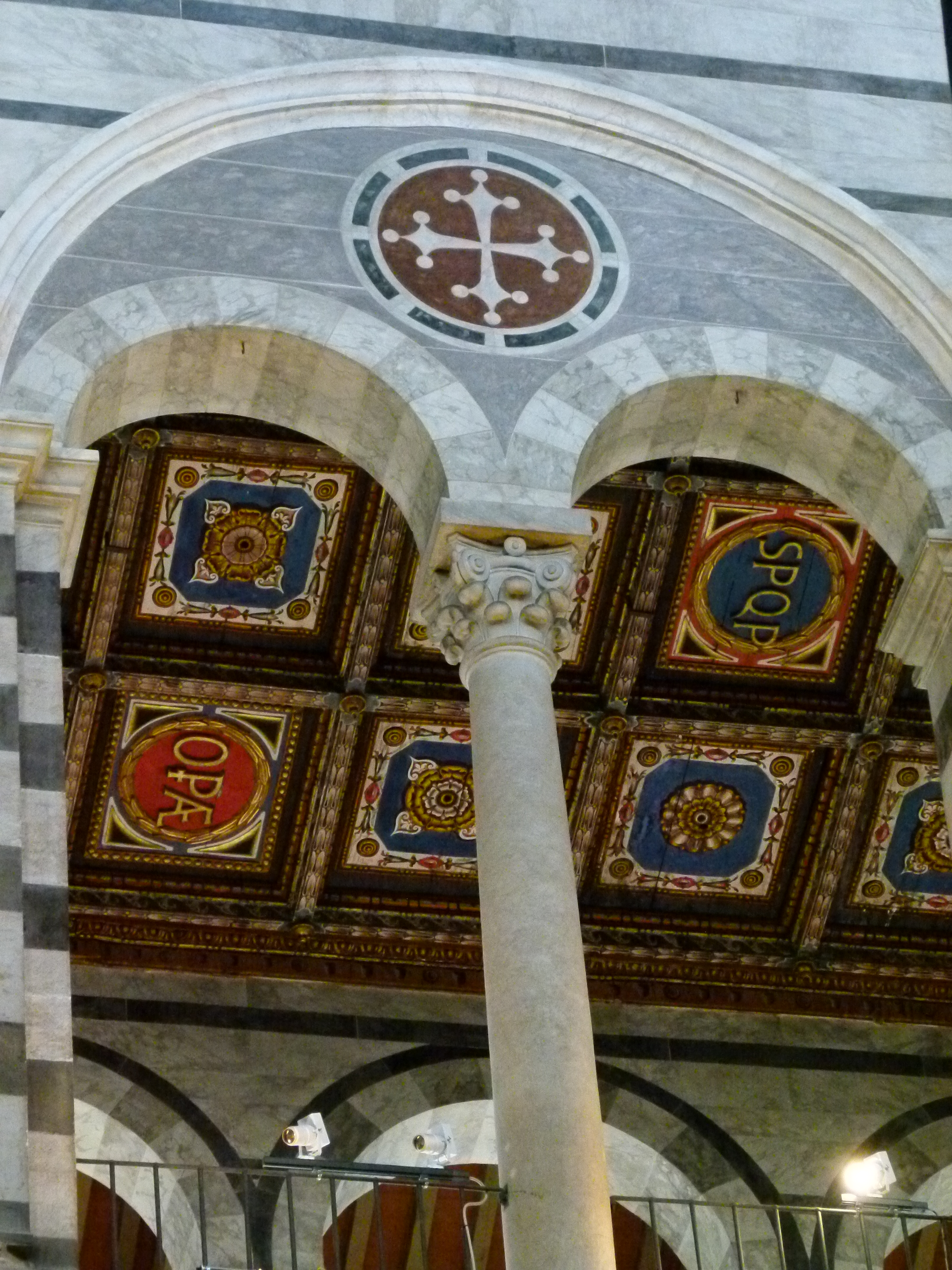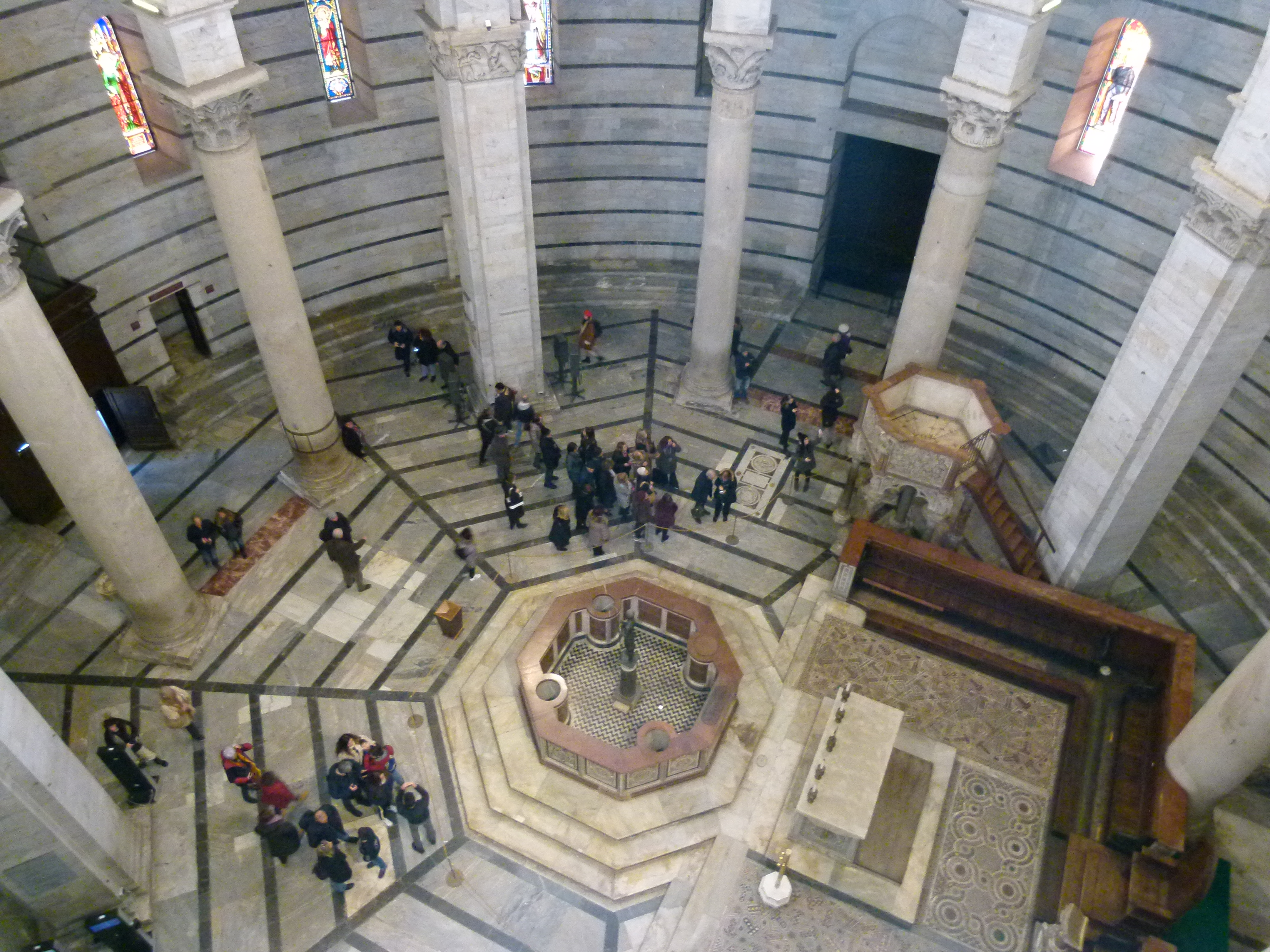 Nous débutons la visite par les choses sérieuses : nous sommes à 5 minutes à pied de la Piazza del Duomo, le grand espace où se situent tous les monuments emblématiques de la ville. Car il n’y a pas que la tour de Pise, mais également une cathédrale, un baptistère, deux musées, un palais, le Camposanto (ancien cimetière)… Un billet couplé permet de rentrer dans tous les sites, ce qui est bien pratique (et la carte de guide-conférencier est à nouveau acceptée, un bon point). Et que dire, à part que tout est absolument magnifique ! Entre les peintures murales du Camposanto représentant les scènes de l’ancien et du nouveau Testament (une vraie BD), la tour en elle-même qui s’élève dans un ciel bleu azur (et penche franchement beaucoup plus en vrai qu’en photo, c’est impressionnant), les plafonds à caisson du Duomo, le baptistère dont nous pouvons gravir les étages, nous y passons plusieurs heures sans voir le temps passer.