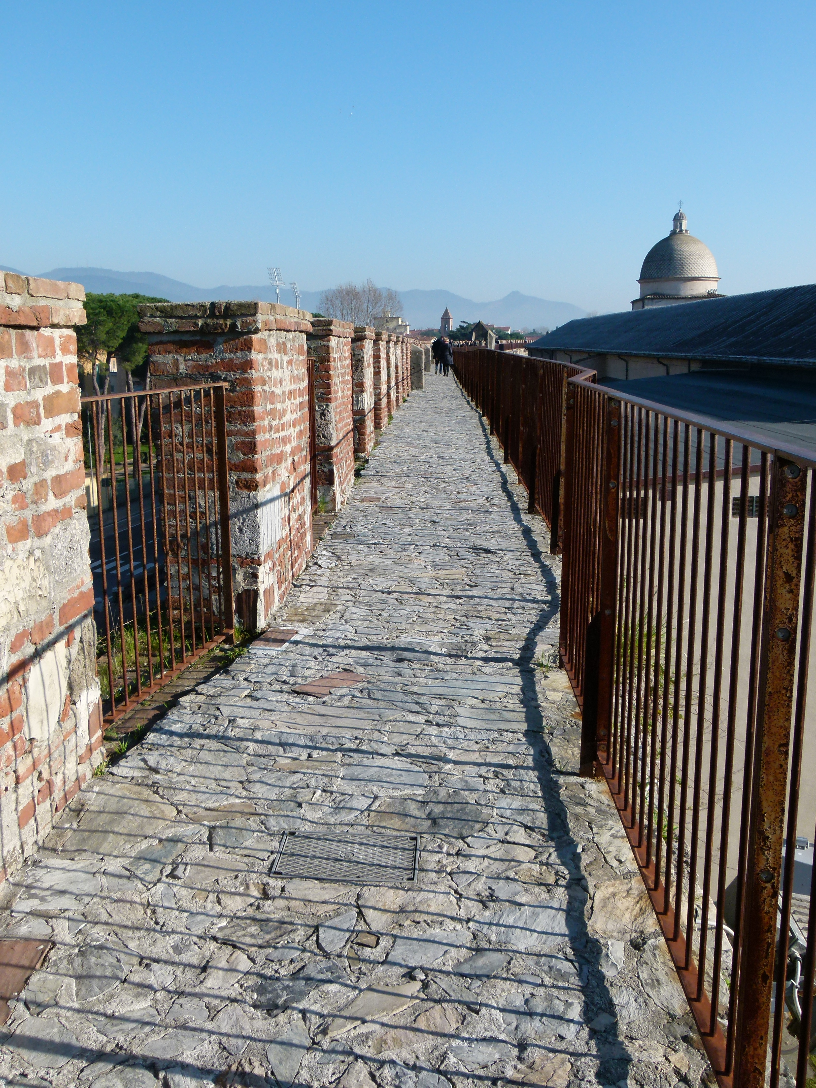 Cette nouvelle année débute sur les chapeaux de roue, puisque nous voulons profiter encore au maximum du temps qui nous reste en Italie avant le dur retour vers notre routine quotidienne… Nous empruntons de ce fait le chemin de ronde du centre historique afin d’admirer les bâtiments vus du haut. Long de 3 kilomètres, il se tient tout simplement sur la muraille médiévale encore apparente dans une bonne partie de la ville, et très bien conservée. Le point de vue est différent, tout est calme, il fait toujours aussi beau, on franchit les quatre portes historiques de la ville, il y a des bastions, des parcs en contrebas, des têtes de palmier, un vrai plaisir.