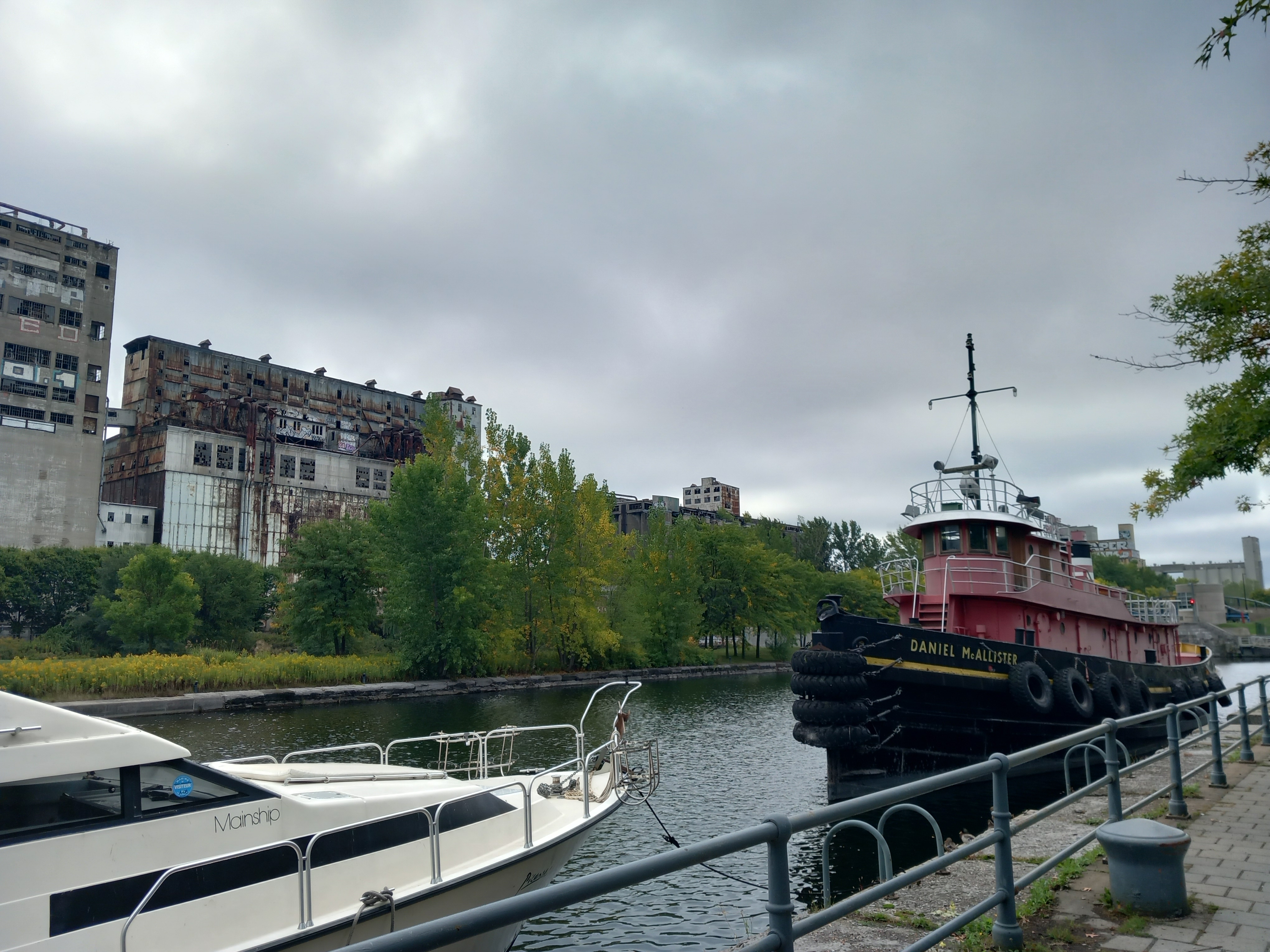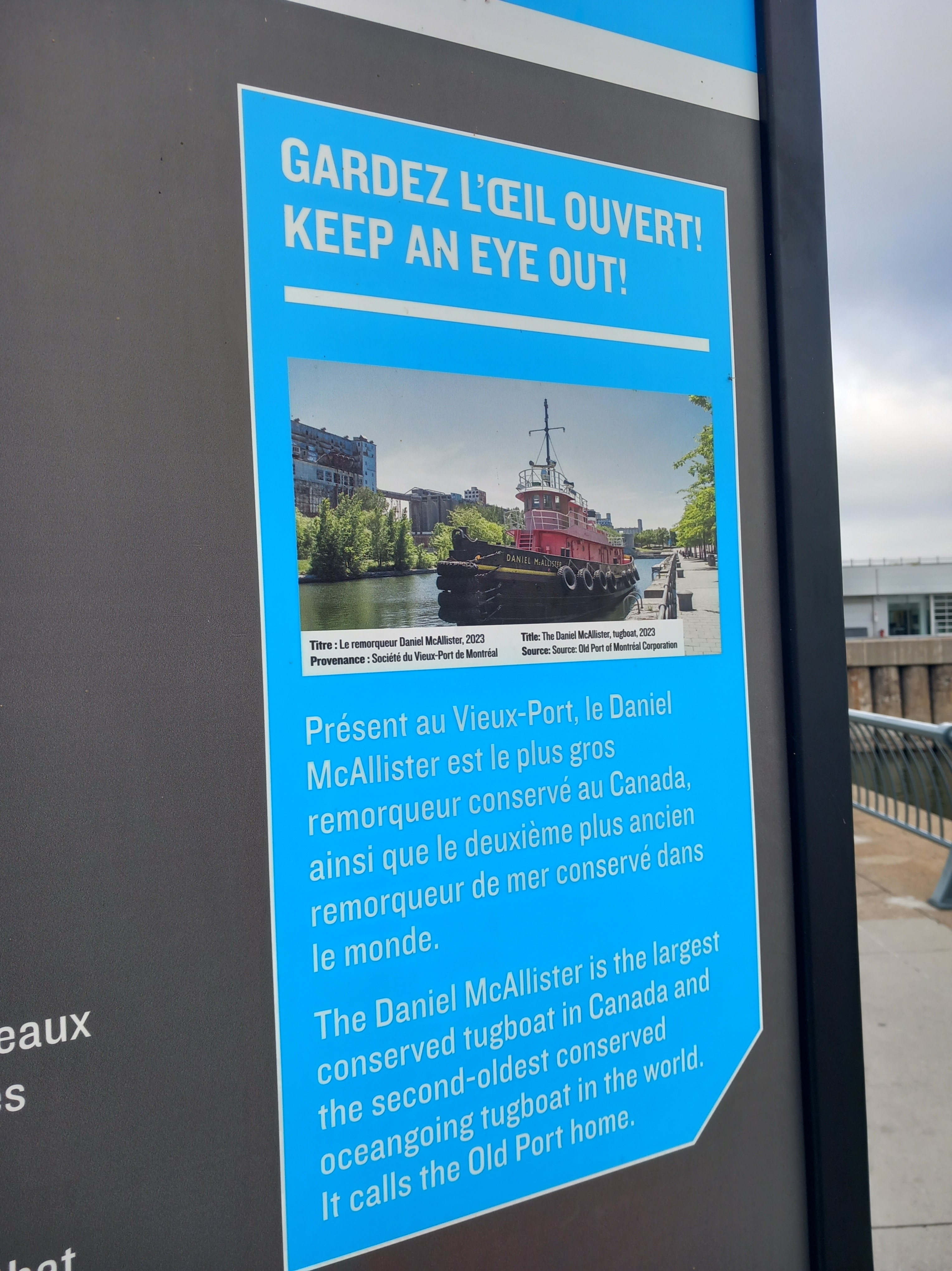 Après un bon petit déjeuner (notre critère de sélection d’hôtel, pour ceux qui connaissent nos habitudes), direction le métro et la station du Square Victoria qui nous transporte rapidement à Paris avec sa reproduction de portique Guimard (petit cadeau de la RATP en 1967 afin de célébrer l’exposition universelle). Nous rejoignons ensuite les quais du quartier du Vieux-Port afin d’admirer le Mac Allister, le plus gros remorqueur conservé au Canada, ainsi que le deuxième plus ancien remorqueur de mer existant dans le monde ! Puis nous marchons jusqu’à la tour de l’horloge le long des quais, sur lesquels se trouve une belle exposition illustrée de photos d’archives sur l’histoire du quartier. Très intéressante et didactique !