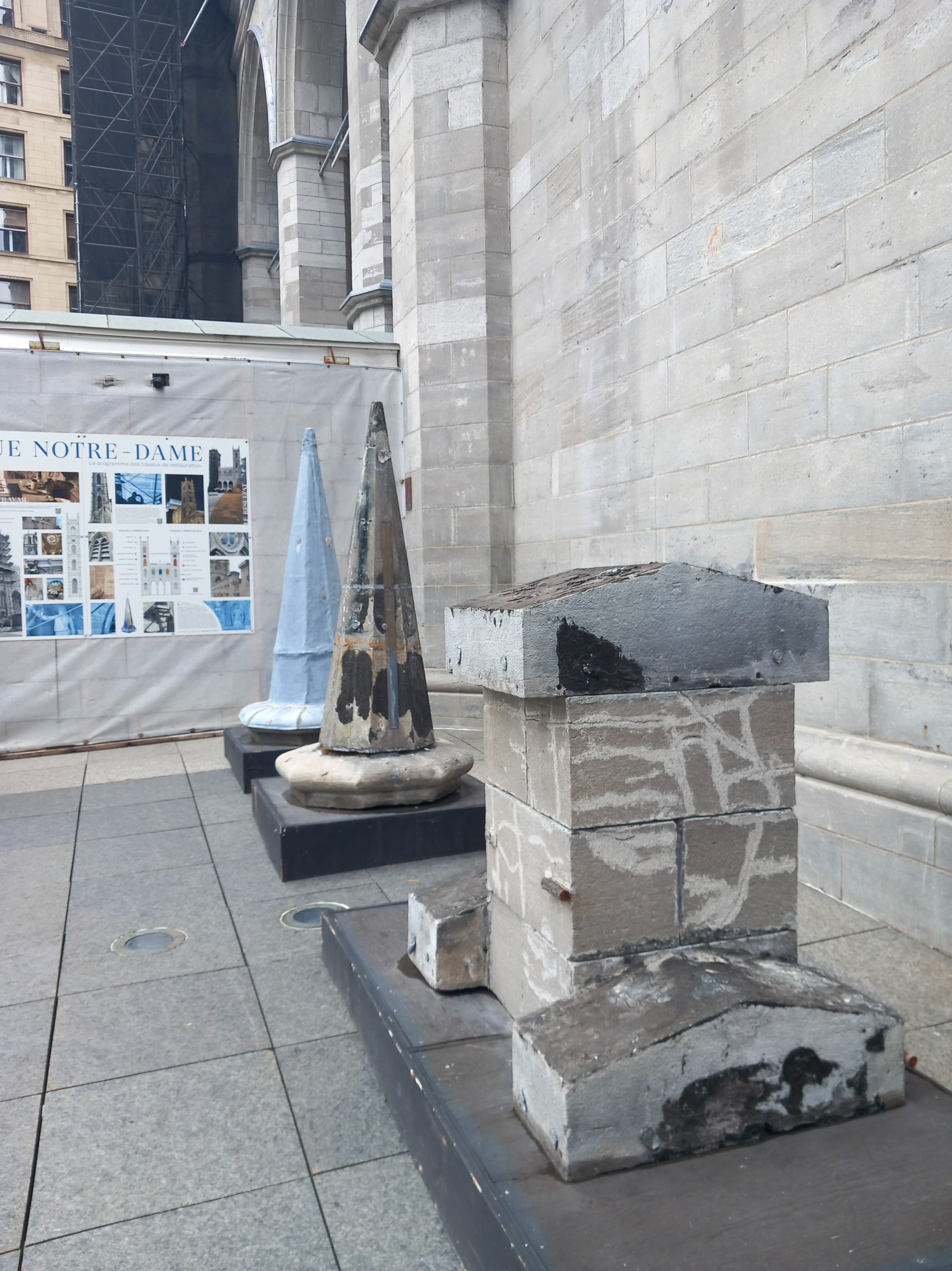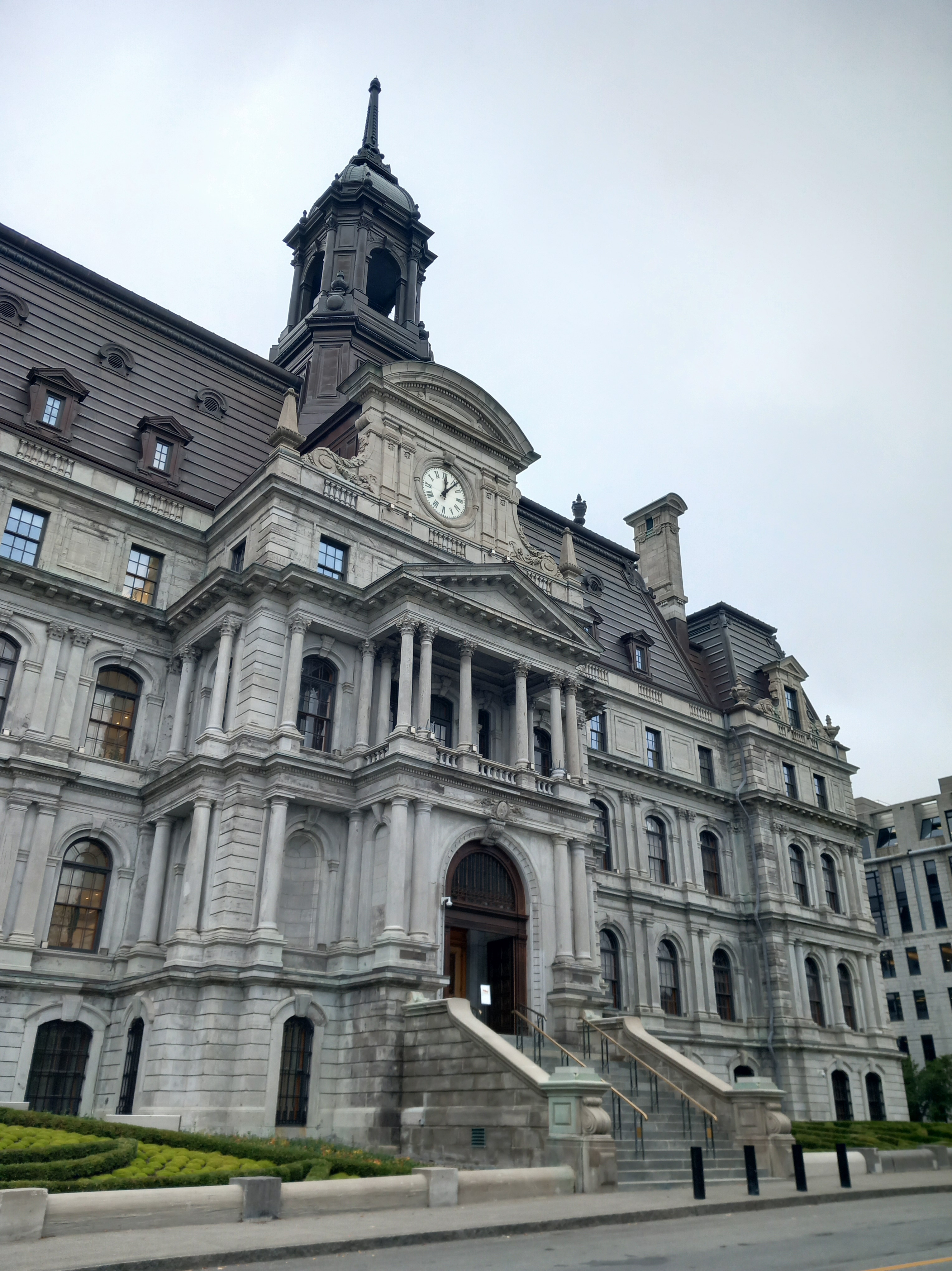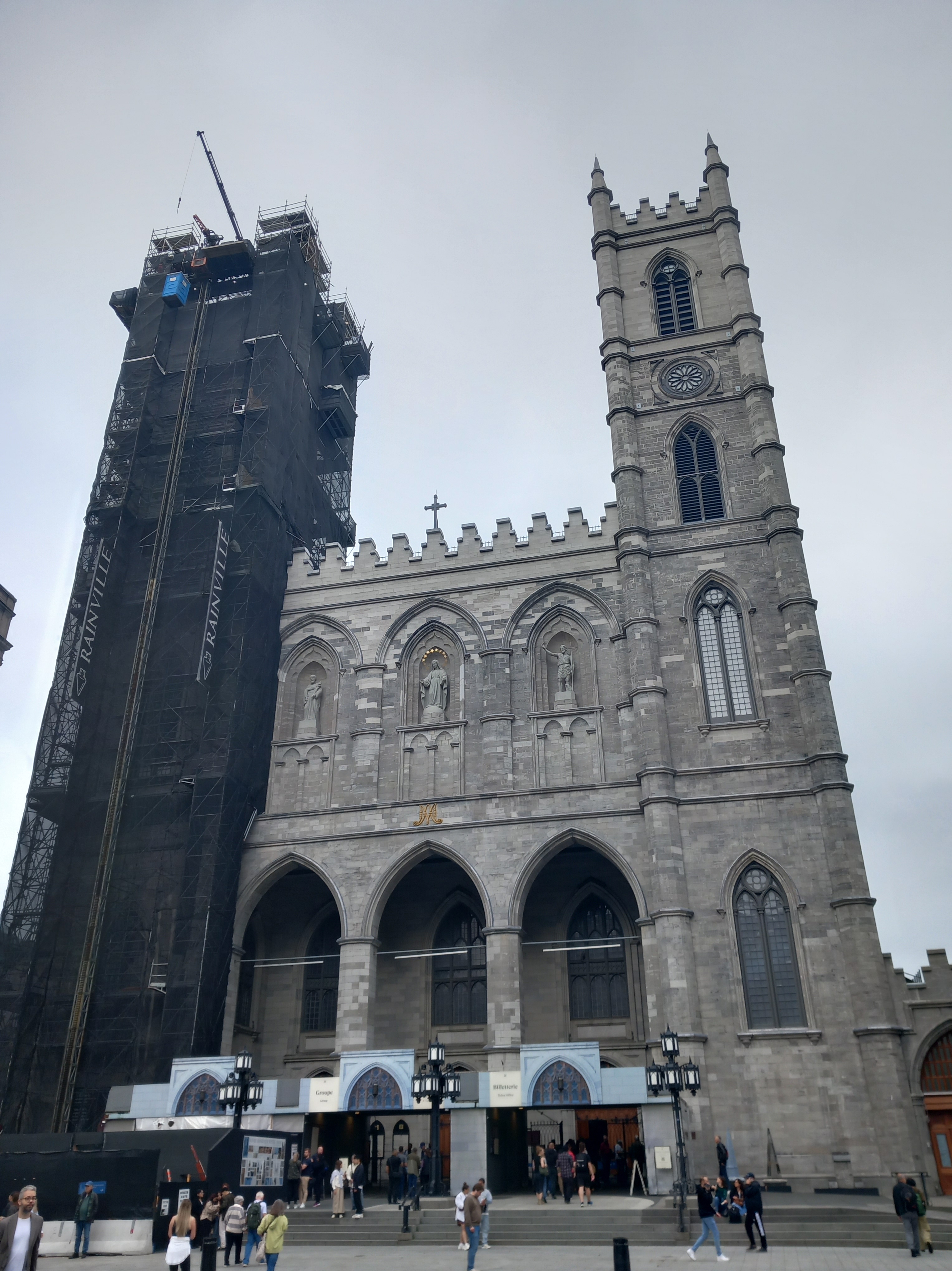 De là, nous essorons littéralement le quartier du Vieux-Port avant de rejoindre le secteur de la place Jacques Cartier via les rues Bonsecours et Notre Dame. On en profite pour visiter le marché couvert, dire bonjour à l’hôtel de ville (« passion mairies » !) et admirer la colonne Nelson avant de continuer notre route vers la place d’Armes et la basilique Notre Dame de Montréal, alors en travaux. Mais une jolie exposition en extérieur permet de se faire une idée des travaux de restauration en cours, et même de toucher des matériaux, ce qui est tout de même assez rare !