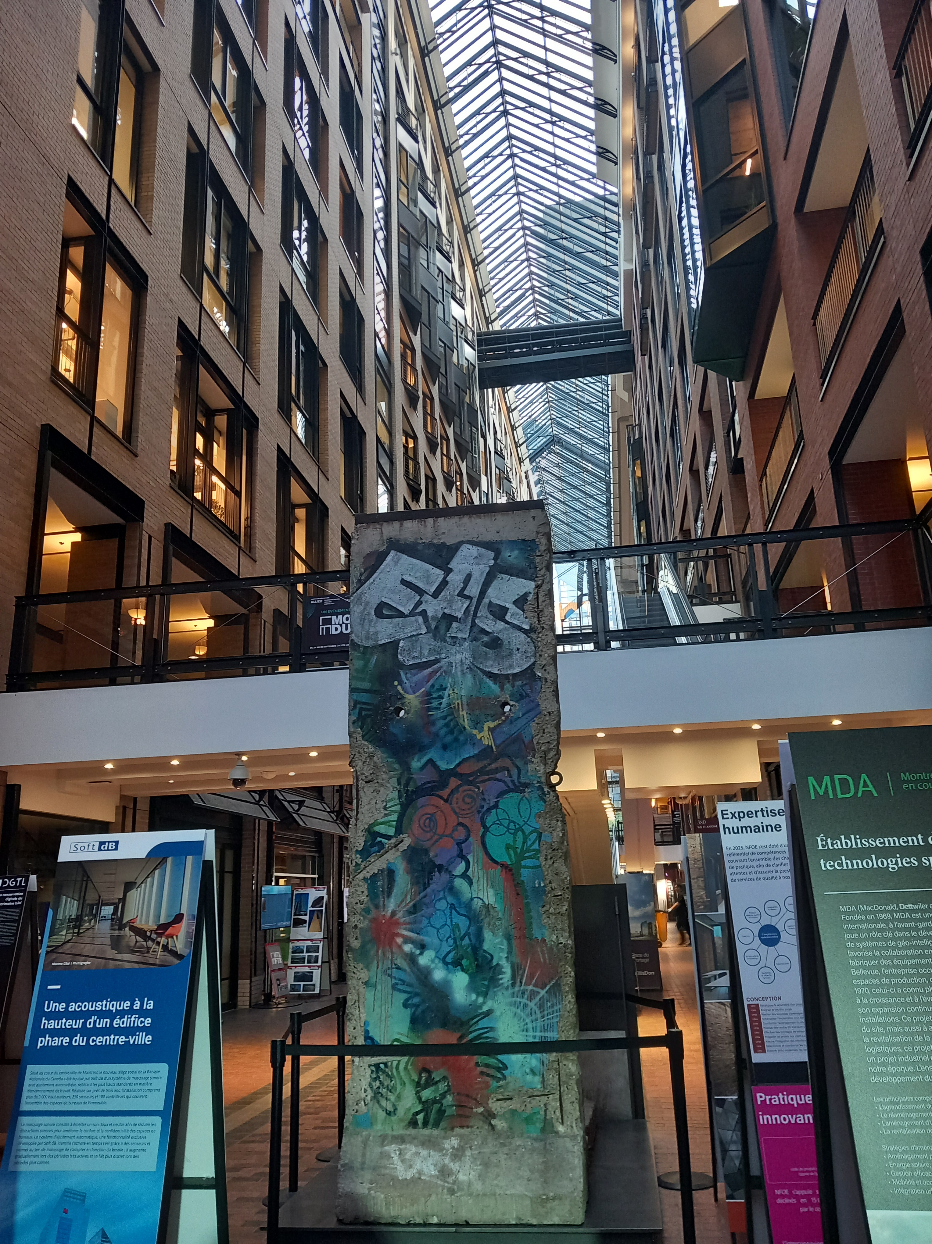 Et la journée avance tranquillement sans que nous ayons encore pu nous promener dans le RESO, ce réseau souterrain de 32 km de long permettant de parcourir la ville à l’abri des conditions climatiques rudes de l’hiver. Nous en connaissons le logo et trouvons une entrée rapidement… et personnellement, j’en ai adoré l’ambiance ! Nous sommes juste seuls au monde, mais sans nous sentir une seconde en insécurité. Nous pouvons remonter dans les rez-de-chaussée des immeubles à tout moment, il y a des expositions (notamment d’objets archéologiques issus des collections de Pointe-à-Callière), des photos, on voit même un morceau du mur de Berlin dans le hall du Centre de commerce mondial quand on remonte à la surface !