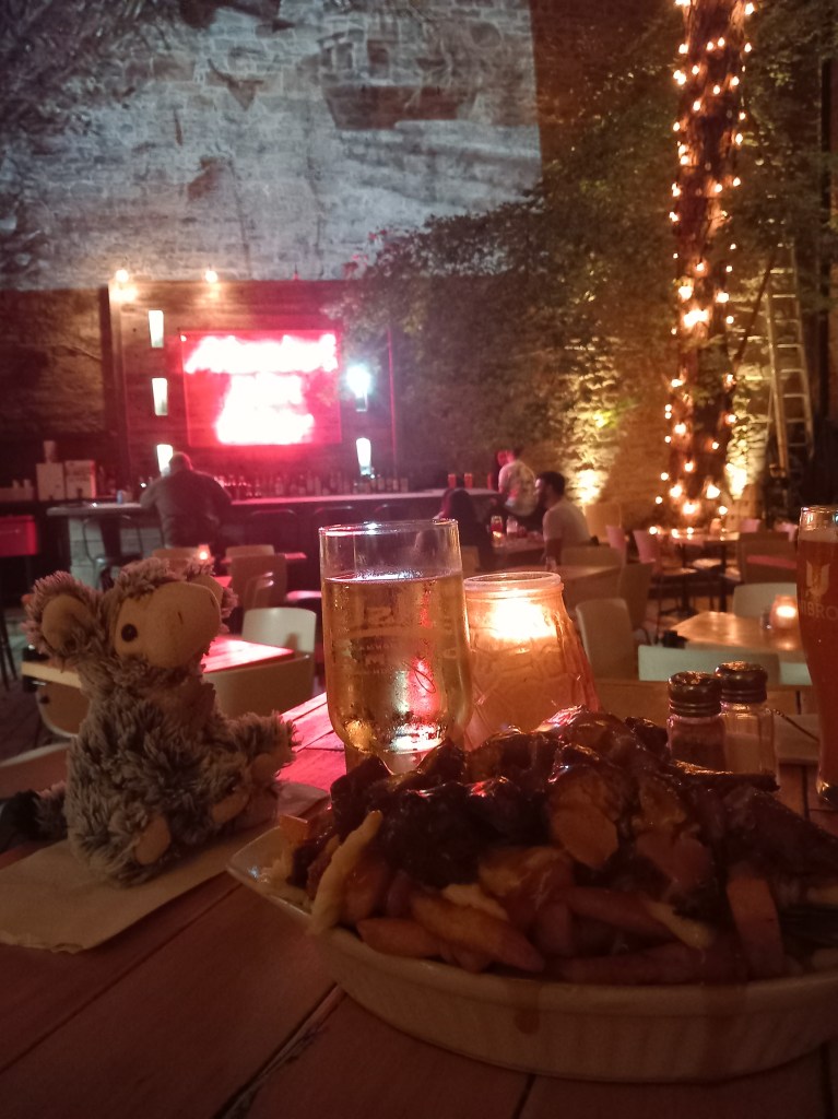 La nuit est déjà tombée sur notre journée, et quoi de mieux, pour un premier repas québecois, de débuter… par une poutine ? Direction le Montreal Poutine, de la rue saint-Paul, à deux pas de la place Jacques Cartier que nous avons visitée plus tôt dans la journée. Bref, c’est gras, c’est bon, ça fait du bien après une journée de marche et notre serveuse (visiblement plus française que québecoise) nous affirme que ce sont les meilleures de la ville, que demander de mieux ? Sachant qu’en plus nous sommes dans une cour intérieure arborée, qu’il faut beau et qu’il y a des bières artisanales !